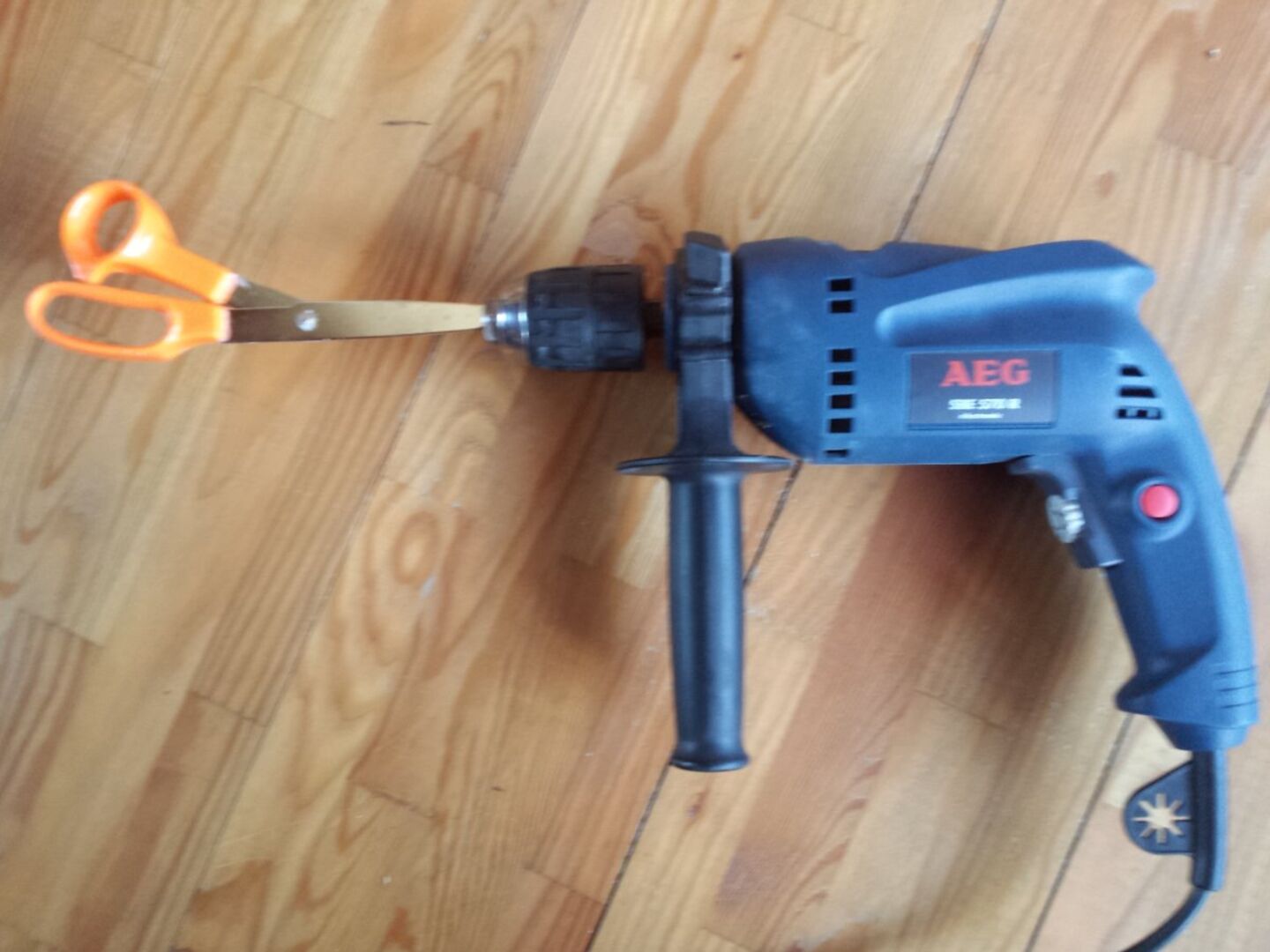 Zum Befestigen der Elemente verwenden wir einen Flexkleber. Dieser muss natürlich erst mal angerührt werden. "Gibt's den Mixer auch in groß?", ist meine Frage, und da wir nun mal keinen Zementrühr-Aufsatz für die Bohrmaschine haben, macht sich Niko einen genialen Trick zu Nutze. Er spannt eine alte Schere mit der Klinge voran ein. Der Griff dient als Quirl-Ersatz und - siehe da - es funktioniert! Ich bin sprachlos.