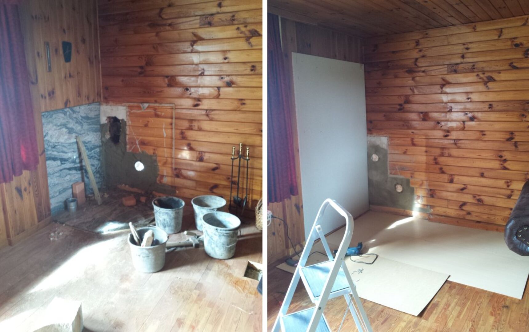 Nach Entfernung der Marmorplatte, die als Ofenunterlage endgültig ausgedient hat, und Abdeckung des restlichen Bodens geht es als Erstes an das Aufstellen der Trägerwand in Form von Trockenbauplatten - besser bekannt als Rigipsplatten. Da wir die Durchführungen für den Ofenanschluss frei lassen müssen, schneiden wir die passenden Öffnungen mittels Lochbohrmaschine in die Rückwand. Ein paar kleine Ausbesserungsarbeiten per Hand, und schon sitzt alles so wie es soll. Die Platten selbst werden mit Senkkopfschrauben an der Wand befestigt.