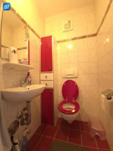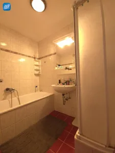 Das geflieste Bad ist mit Dusche und Wanne ausgestattet