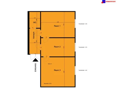Die Nutzfläche im Ausmaß von 66m² teilt sich auf ein zentrales Vorzimmer und drei weitere getrennte Büro