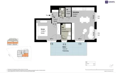 Wohnfläche: ca. 53,35m² + Balkon: ca. 15,94m² + Kellerabteil