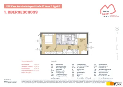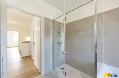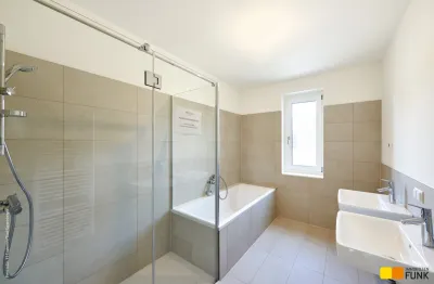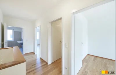 Im 01. Obergeschoß erschließt der zentral angelegte Flur (ca. 6,97 m²) zwei großzügige Schlafzimmer. Eines davon ist als Master-Bedroom (ca. 17,19 m²) mit Platz für einen großen Schrank geplant. Das andere Schlafzimmer weist eine Fläche von ca. 12,27 m² auf. Ein geräumiges Badezimmer (ca. 7,70 m²) mit Badewanne und Dusche, einem Doppelwaschtisch, einem Handtuchheizkörper sowie dem Waschmaschinenanschluss finden Sie ebenso wie ein separates WC (ca. 2,65 m²) mit Handwaschbecken und eine zusätzliche Abstellnische. Die Innenstiege führt Sie vom Flur aus in das lichtdurchflutete Dachgeschoß, das zwei weitere Schlafräume mit jeweils eigenen Dachterrassen bietet.