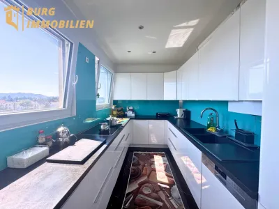 Die Küche ist in einer Nische untergebracht, bietet jedoch überraschend viel Raum und Stauraum. Besonders hervorzuheben sind die ausgezeichneten Lichtverhältnisse: Direkt vor der Arbeitsfläche befinden sich Fenster, die auch an trüben oder regnerischen Tagen für ausreichend Helligkeit sorgen – so sind gute Arbeitsbedingungen jederzeit gewährleistet. Helle Fronten und ein pflegeleichter Fliesenboden runden das moderne Erscheinungsbild der neuwertigen Küche ab.