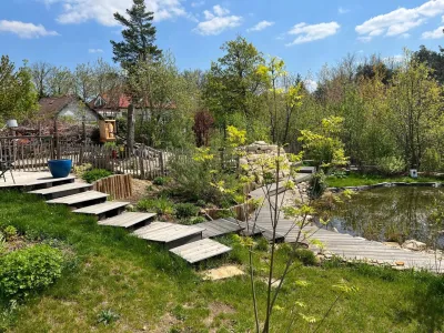 Der Außenbereich dieser Villa ist ein wahres Paradies.! Hier finden Sie Platz zum Abschalten nach einem stressigen Arbeitstag, oder sie lassen einfach die Seele baumeln und genießen Sie die Vielfalt der vorhanden Pflanzen, Sträucher und Bäume. Selbstverständlich stehen auch zahlreiche Obstbäume und Beerensträucher zur Verkostung bereit. Die beiden Schwimmteiche sind nicht nur ein Paradies für die zahlreichen Vögel, welche ihre ständigen Besucher und Freunde werden, sondern sie dienen auch perfekt zur Abkühlung und zum Badespaß an heißen Sommertagen.