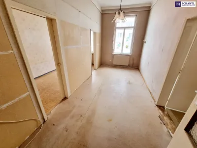 Ihre neue Wohnung ist aktuell sanierungsbedürftig und bietet Ihnen die Chance, Ihre Wünsche umzusetzen! Sie teilt sich in einen Vorraumbereich mit Platz für eine Garderobe, ein Badezimmer, ein WC, eine separate Küche mit Fenster und Platz für einen kleinen Esstisch, ein zentrales und geräumiges Wohn-Esszimmer, sowie 2 Schlafzimmer/Arbeitszimmer.