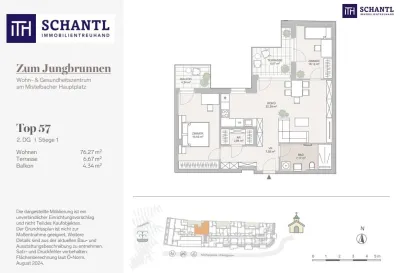 Wohnfläche: ca. 76,27m² + Terrasse: ca. 6,67m² + Balkon: ca. 4,43m² + Kellerabteil: ca: 1,04m²