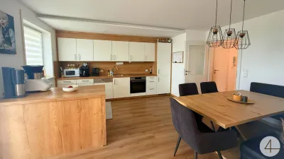 Die moderne Küche ist ideal für die Zubereitung köstlicher Mahlzeiten und lädt zu geselligen Kochabenden mit Freunden oder Familie ein.