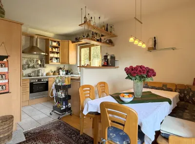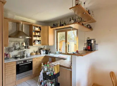 Dann geht’s gleich rechts weiter in den Herzstück-Bereich – Wohnen, Essen, Leben! Die offene Küche fügt sich perfekt ein, ohne sofort ins Auge zu springen. Ums Eck zaubern Sie köstliche Gerichte für Ihre Familie, während am Esstisch Platz für alle ist. Immer mit Blick in den Garten! Und nach dem Essen? Einfach rechts abbiegen und auf der Couch versinken – Netflix ruft schon!