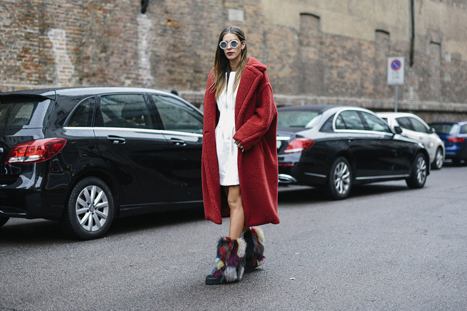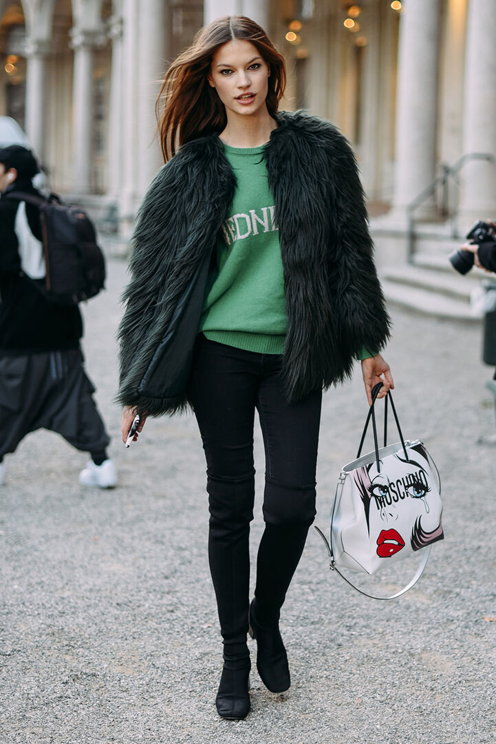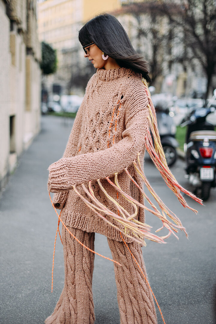 Mehr Wolle geht nicht! Mehr Strick-Chic aber auch nicht. Ein sicherer Blickfang bei der Fashion Week in Mailand.
