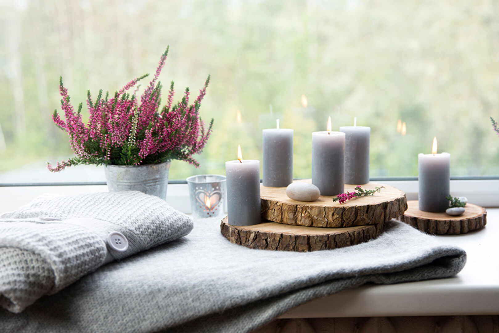 Um Effekte zu erzeugen, braucht es nicht viel: Holzscheiben, Kerzen und Heidekraut - und fertig ist die herbstlich inspirierte Deko-Landschaft.