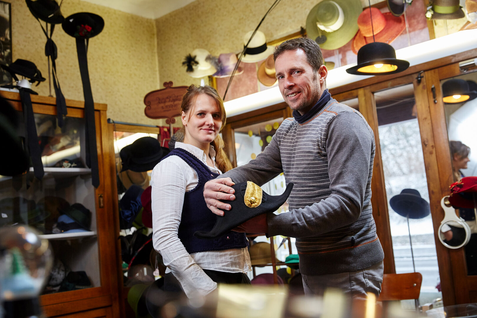 Der Auftritt der Spanischen Hofreitschule; was haben die Reiter auf dem Kopf? Sie haben etwas gemeinsam mit Trägern der Schladminger Kappe, modischer Damenhüte, trendiger Herrenhüte und von Trachtenhüten für sie und ihn: ihre perfekte Kopfbedeckung kommt aus einer Grazer Manufaktur.
