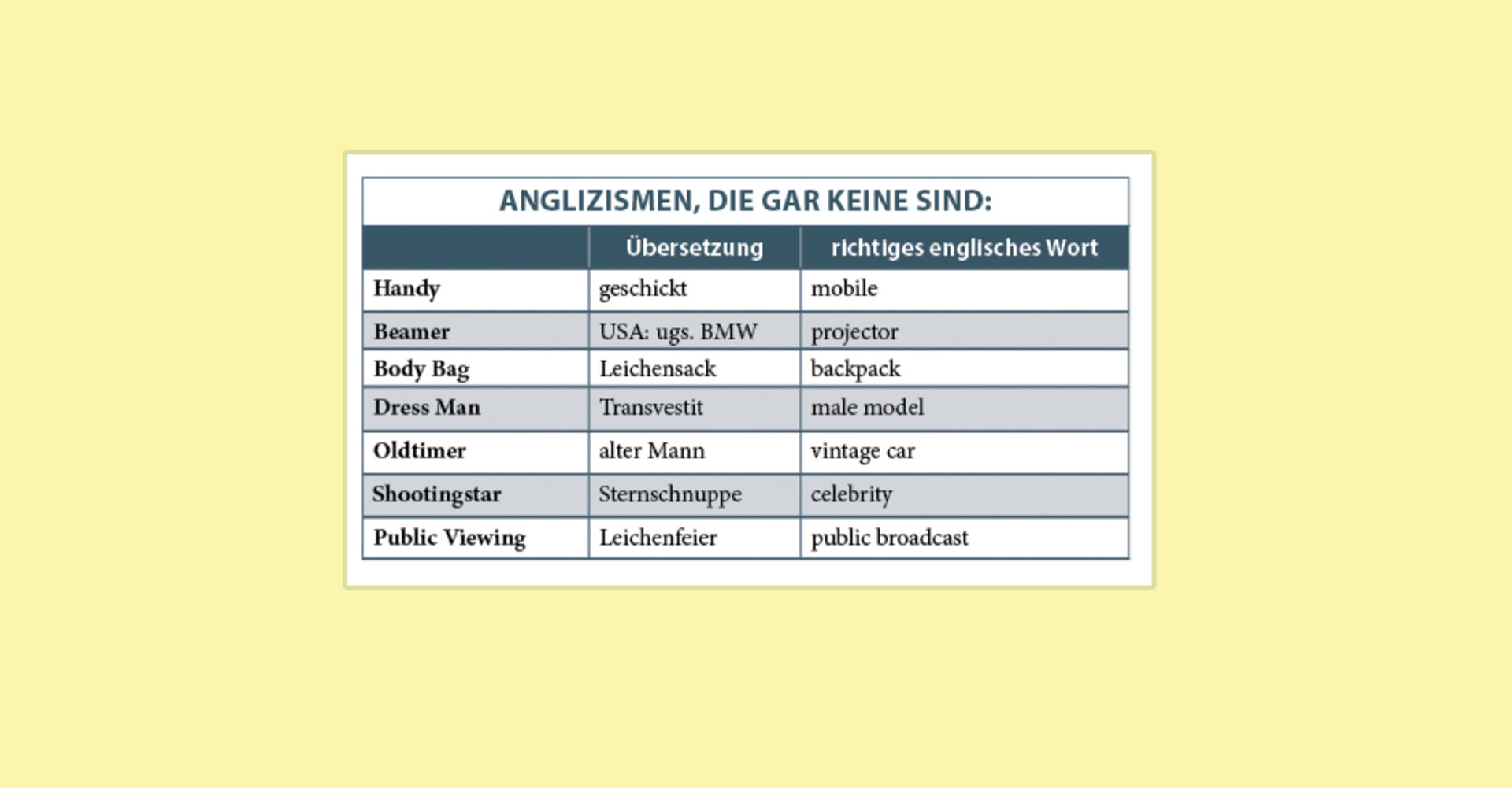 Der Trend zum Englischen ist somit ungebrochen. Unter den Neuwörtern der 90er-Jahre machten die Anglizismen bereits 40 Prozent aus, wie das Institut für Deutsche Sprache ermittelt hat. Dieser Anteil dürfte heute sogar noch um einiges höher sein – wobei sich unter diese englischen Wörter auch so manche heimische Wortkreation gemischt hat. Diese klingen zwar englisch, sollte man aber definitiv nicht außerhalb des deutschen Sprachraums verwenden. Oder war Ihnen bewusst, dass die Einladung zu einem Public Viewing im englischsprachigen Raum einer Einladung zu einer Leichenfeier entspricht?
