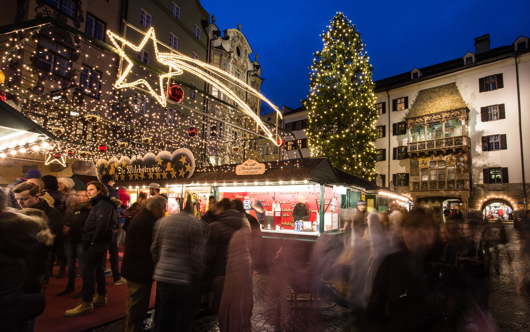 Direkt unter dem Innsbrucker Wahrzeichen, dem Goldenen Dachl, können Sie den stimmungsvollen Markt besuchen. Umgeben von historischen Gebäuden, herrscht ein ganz besonderes Vorweihnachtstreiben. Der diesjährige Christbaum: eine 14-Meter hohe Fichte, geschmückt mit rund 1.300 Lichtern. Für musikalische Untermalung sorgen die Klänge der Turmbläser am Goldenen Dachl.