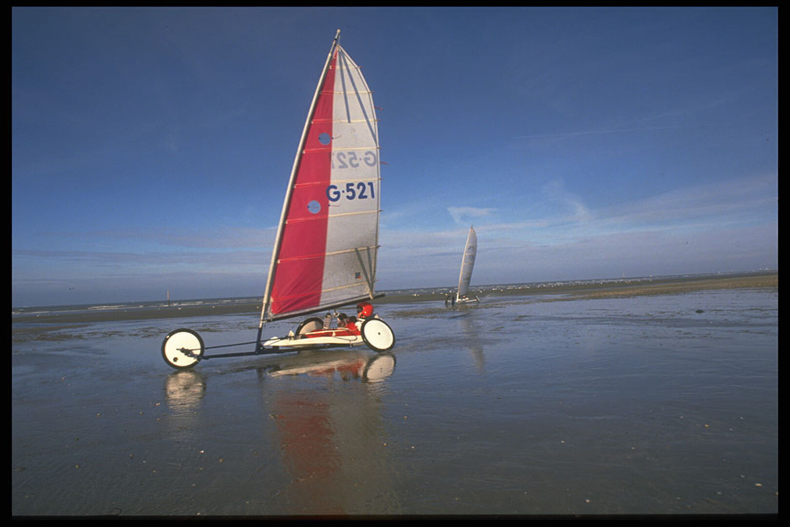 Vom Bus im Wasser nun zum Boot am Strand: Der Strandsegler sieht zwar aus wie ein Schiff mit Segel, bewegt sich aber auf Rädern fort…