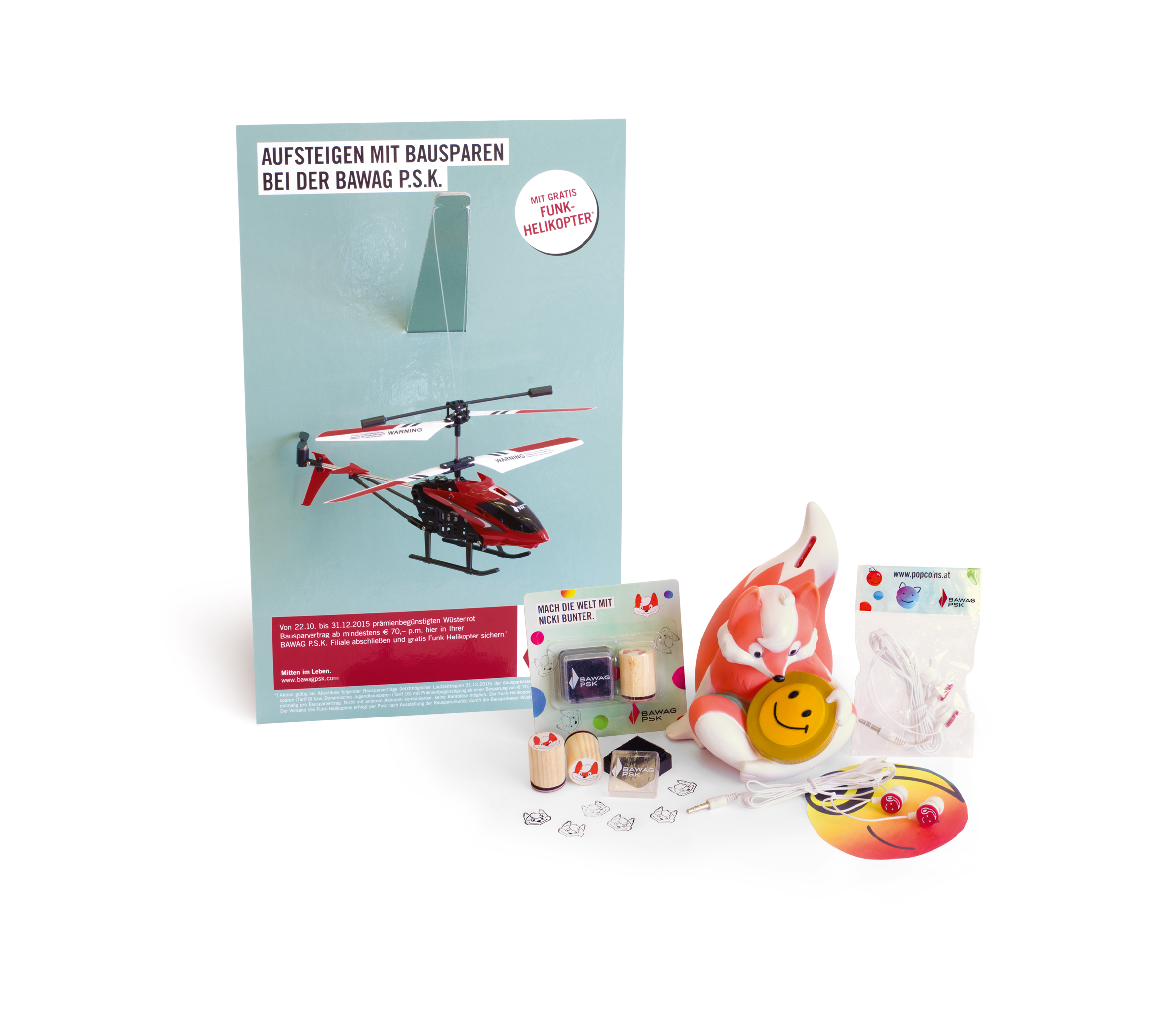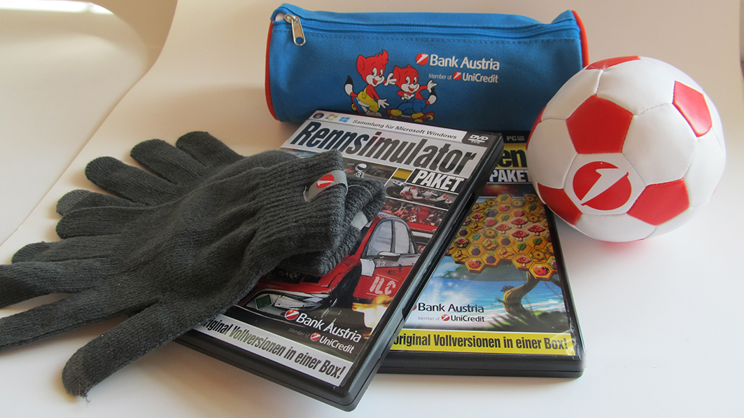 Bank Austria: PC-Spiele, ein Schüttelpennal mit Fix & Foxi-Motiv, ein Softball und Touch-Handschuhe für Smartphones und Tablets