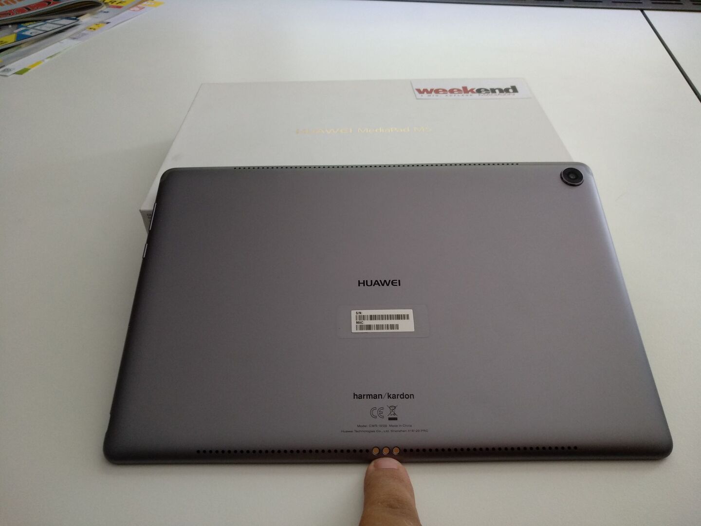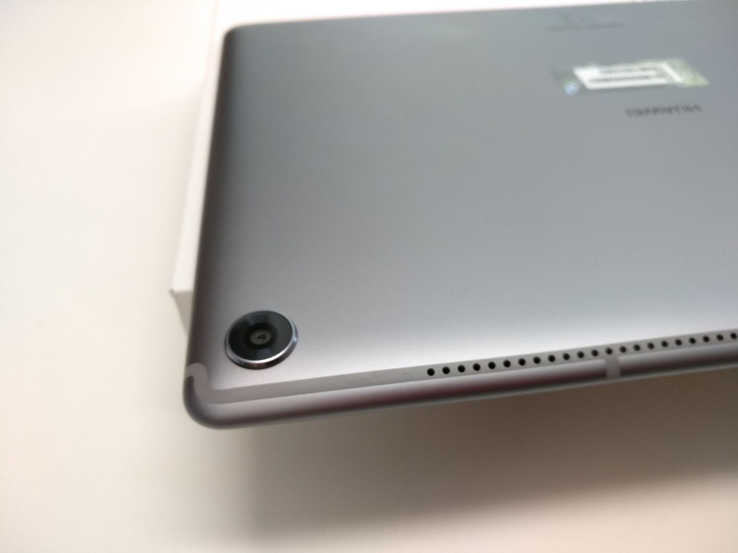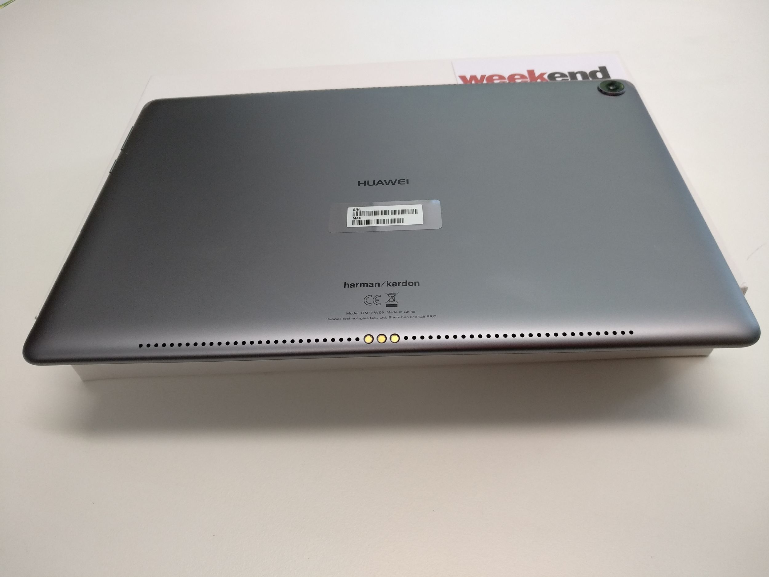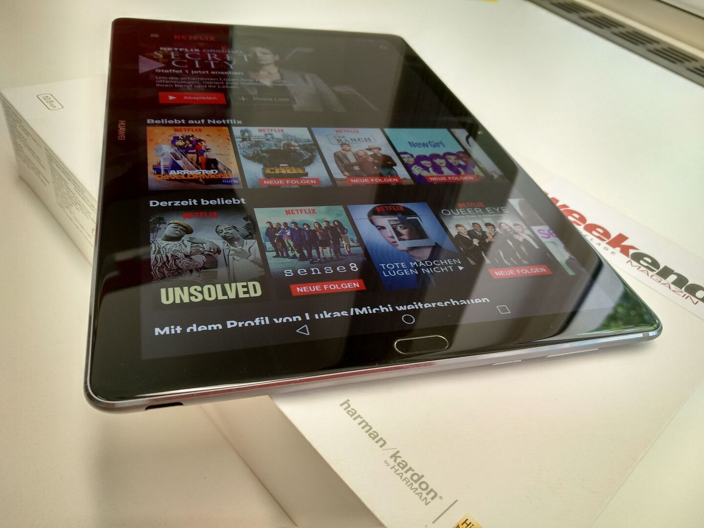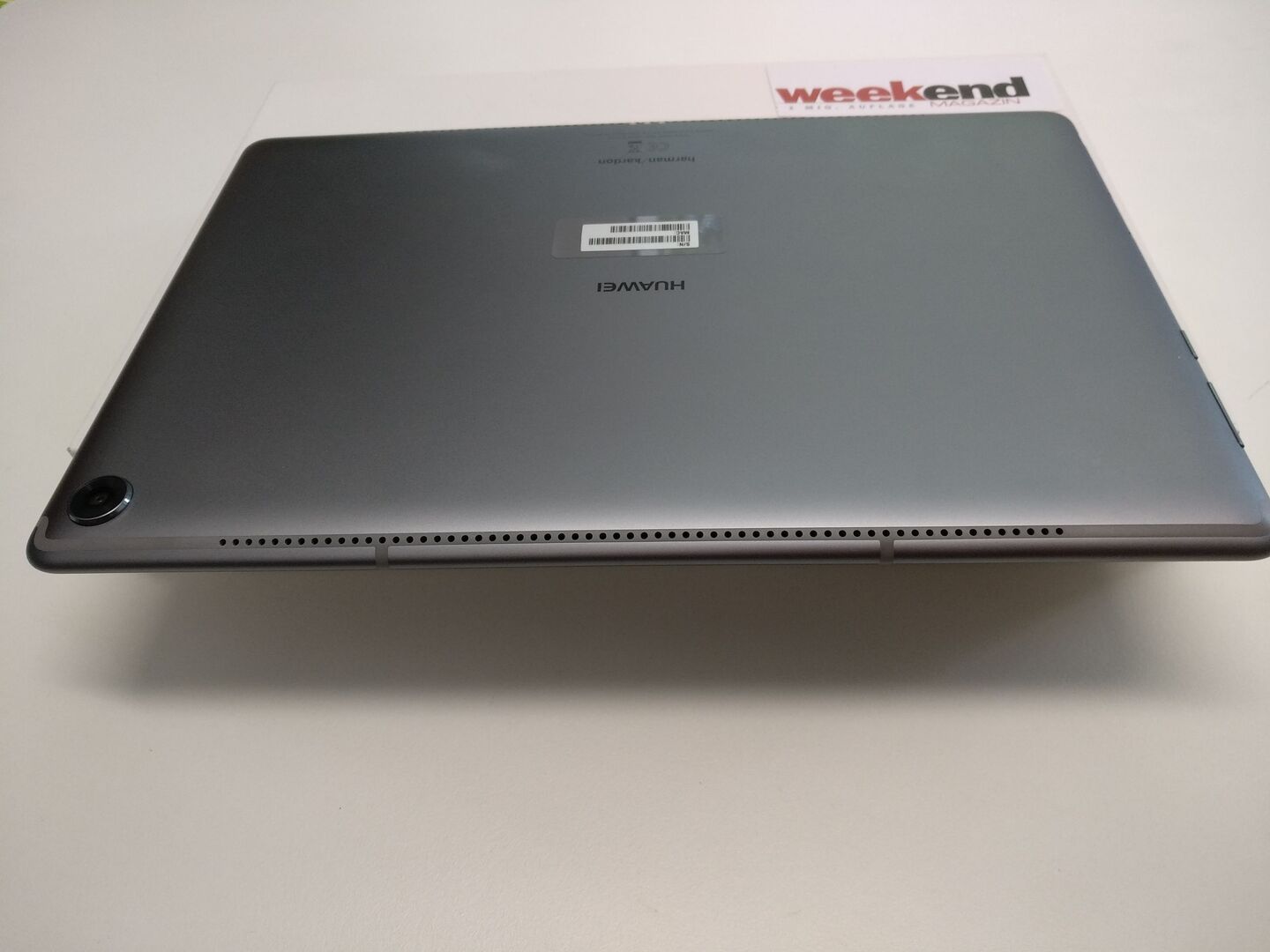 Von vorne betrachtet ist das M5 ein normales 10-Zoll Tablet - in Huaweis Fall aber sogar mit Fingerprintreader. Der funktioniert, wie von Huawei gewohnt, exzellent. Lustig wird es auf der Hinterseite: Dort fallen vor allem die vielen kleinen Löcher auf. Oben wie unten. Aber nein, da hat sich kein Chinese mit einer Stanzmaschine ausgetobt, das sind die hervorragenden Harman/Kardon Stereo-Lautsprecher (insgesamt vier, also oben und unten Stereo!!!). So viel Wumms in einem so flachen Gerät hab ich noch nie erlebt - absolut erstklassig! Weiters befindet sich auf der Rückseite eine 13-Megapixel Hauptkamera.