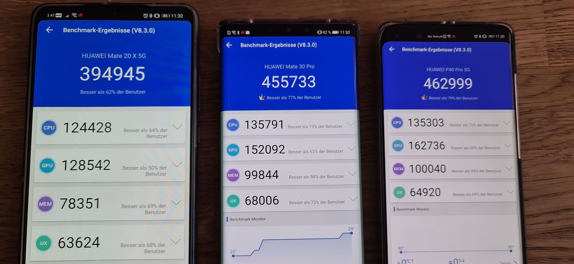 Drei Huawei Geräte im Vergleich: Links das Mate 20X 5G mit Kirin 980 (mein derzeitiger Daily Driver), in der Mitte das Mate 30 Pro mit Kirin 990 und rechts das P40 Pro, ebenso mit Kirin 990. Die Ergebnisse der beiden Top-Geräte sind de facto identisch und setzen sich vom Vorjahresgerät klar ab. Zum Vergleich: ein Samsung S20 Ultra 5G erreichte in meinen Tests um die 510.000 Punkte.