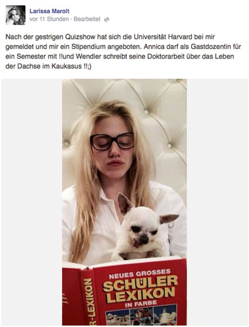 Doch zum Glück nimmt Larissa den Shitstorm mit Humor. Auf ihrer Facebook-Seite überraschte sie mit einem witzigen Konter und schreibt: "Nach der gestrigen Quizshow hat sich die Universität Harvard bei mir gemeldet und mir ein Stipendium angeboten..."