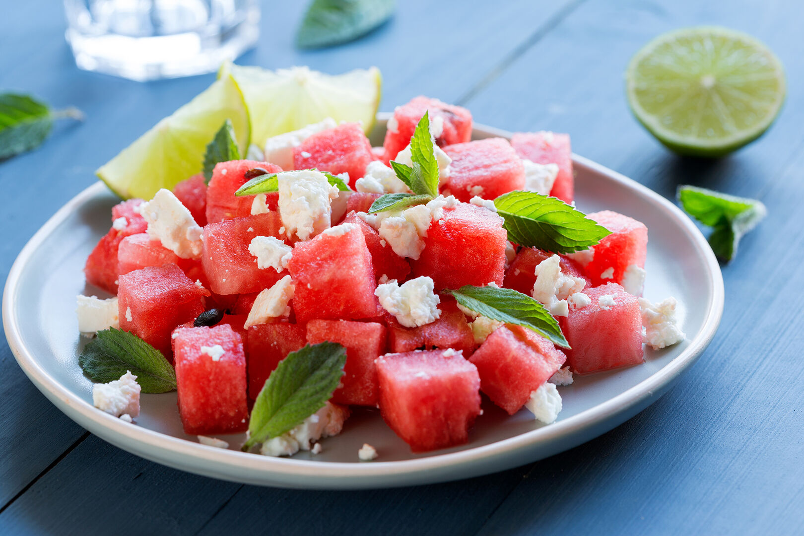 Wassermelone besteht zu rund 95 Prozent aus Wasser. Im Sommer ist sie – vor allem gekühlt – ein perfekter, erfrischender Snack. Möchten Sie der Wassermelone etwas Finesse verleihen, können Sie sie in dünne Dreiecke schneiden und mit Fetakäse und Blattpetersilie belegen. Andere Obst- und Fruchtsorten können ebenfalls als Topping verwendet werden. Der Snack eignet sich auch für eine Grillparty oder als Vorspeise.