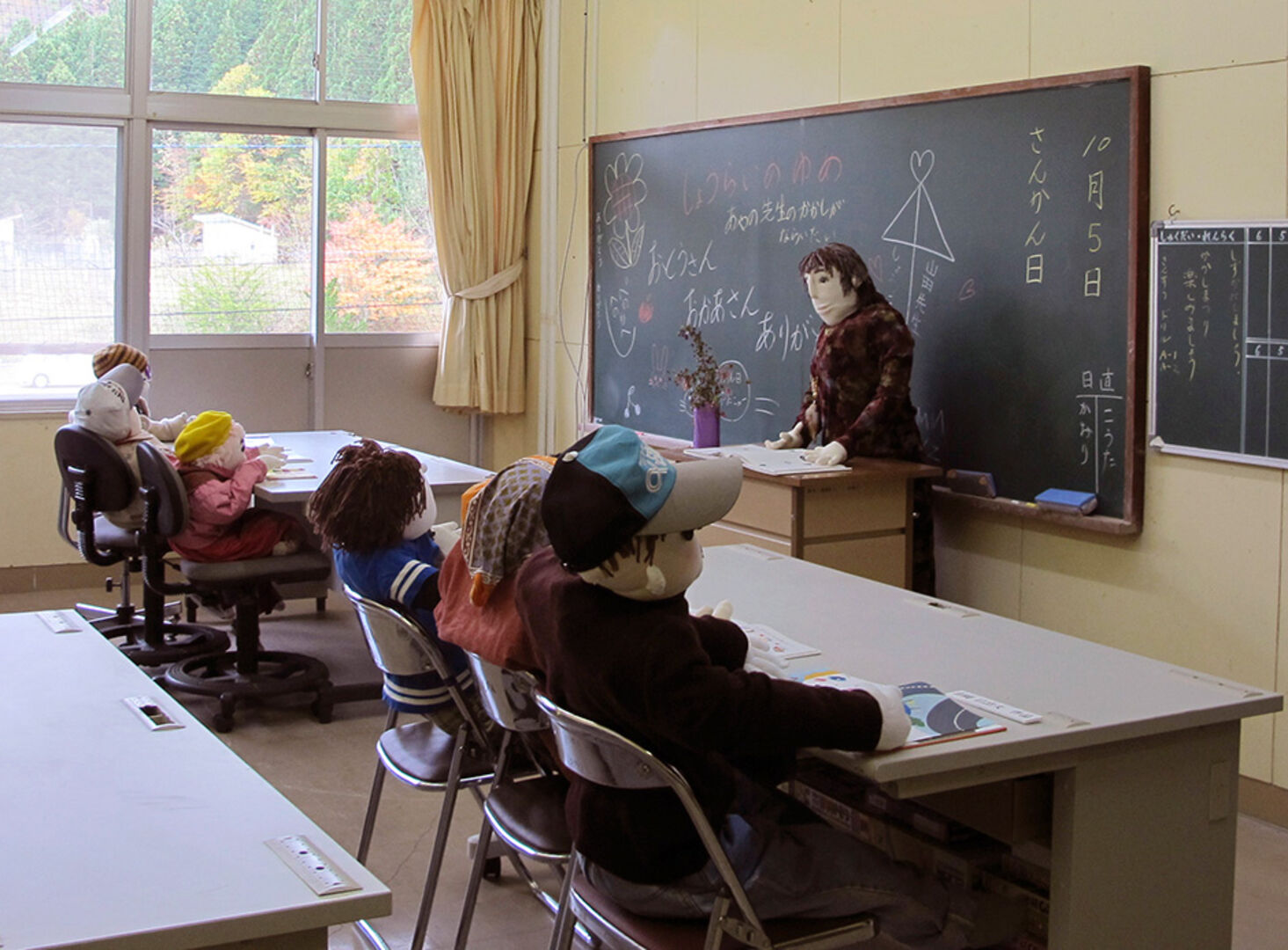Die Großmutter-Puppen gelingen Ayano Tsukimi immer besonders gut. Die Herausforderung bei der Anfertigung der Kunstwerke ist das Gesicht. Vor allem der Mund ist schwer zu nähen, und eine falsche Bewegung reicht, um aus einer freundlichen Gestalt eine grimmige Puppe zu machen. Selbst die Schule, die ihren Betrieb schon lange eingestellt hat, ist voll mit den stummen Genossen. Schüler, Lehrer und sogar ein Direktor sind im Klassenzimmer und auf den Gängen anzutreffen. Auf dem Lehrerpult stehen immer frische Blumen, die Szene soll ja möglichst echt aussehen. Die Beschäftigung wird der kreativen Dame sicher nicht ausgehen: Alle drei Jahre muss sie die Exemplare, die im Freien stehen, aufgrund der Witterungsschäden gegen neue austauschen.