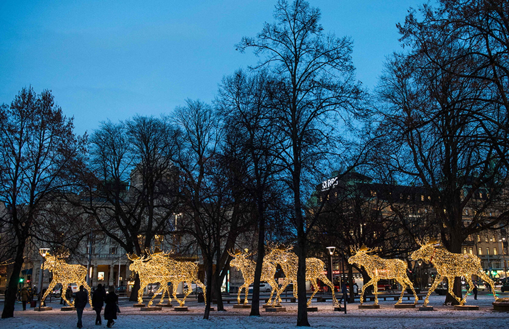 In der Weihnachtszeit erhellen mehr als 700.000 Lichter Stockholm. Einige davon, um diese beeindruckende Elch-Herde aus Metall zum Strahlen zu…