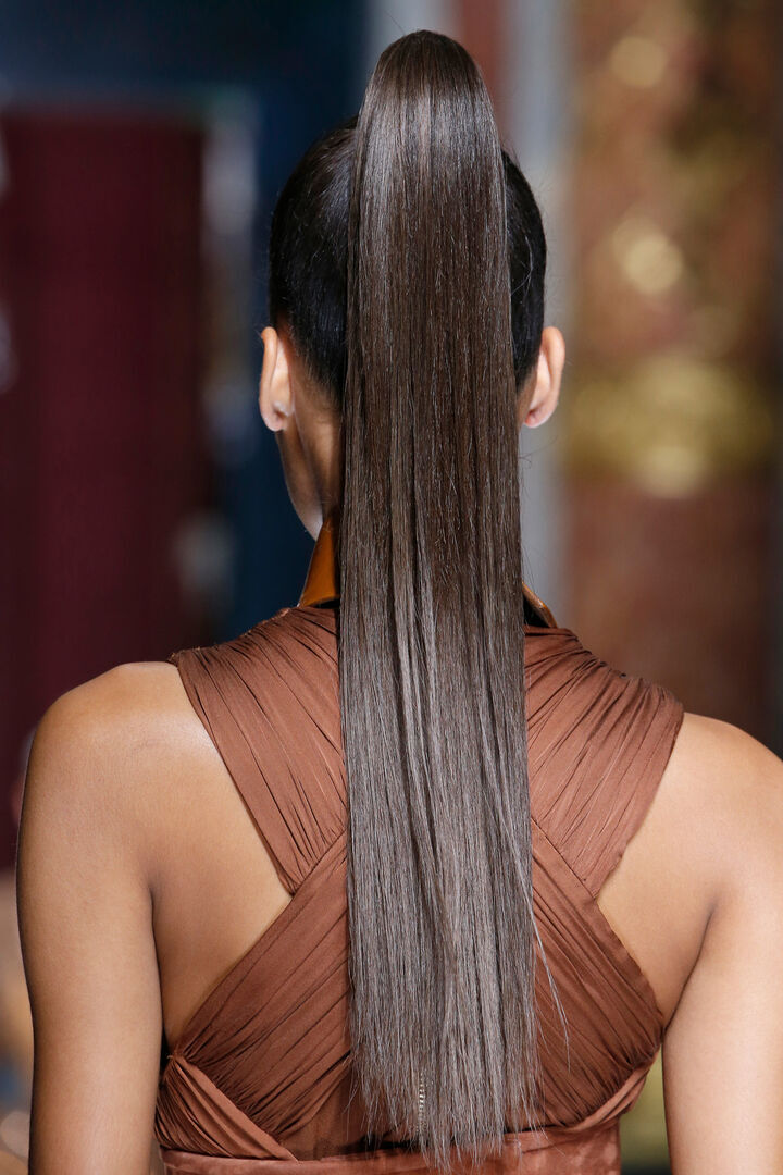 Nach dem tiefen Dutt in den letzten Jahren folgt der tief gebundene Zopf. Im Gegensatz zum Messy Bun liegt der Pferdeschwanz jedoch glatt und fest im Nacken. Fixiert wird er mit Glanzspray oder Haargel. Tipp für diesen Look: Der Haargummi sollte nicht zu sehen sein. Stattdessen können Sie Ihre eigenen Haare um den Zopf wickeln.