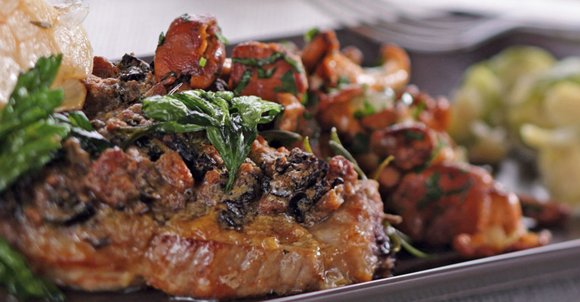 Die Koteletts mit den restlichen gehackten Backpflaumen bestreuen und mit dem Eierschwammerl-Rosenkohl-Gemüse servieren. Die frittierten Petersilienblätter dekorativ auf dem Fleisch anrichten.
