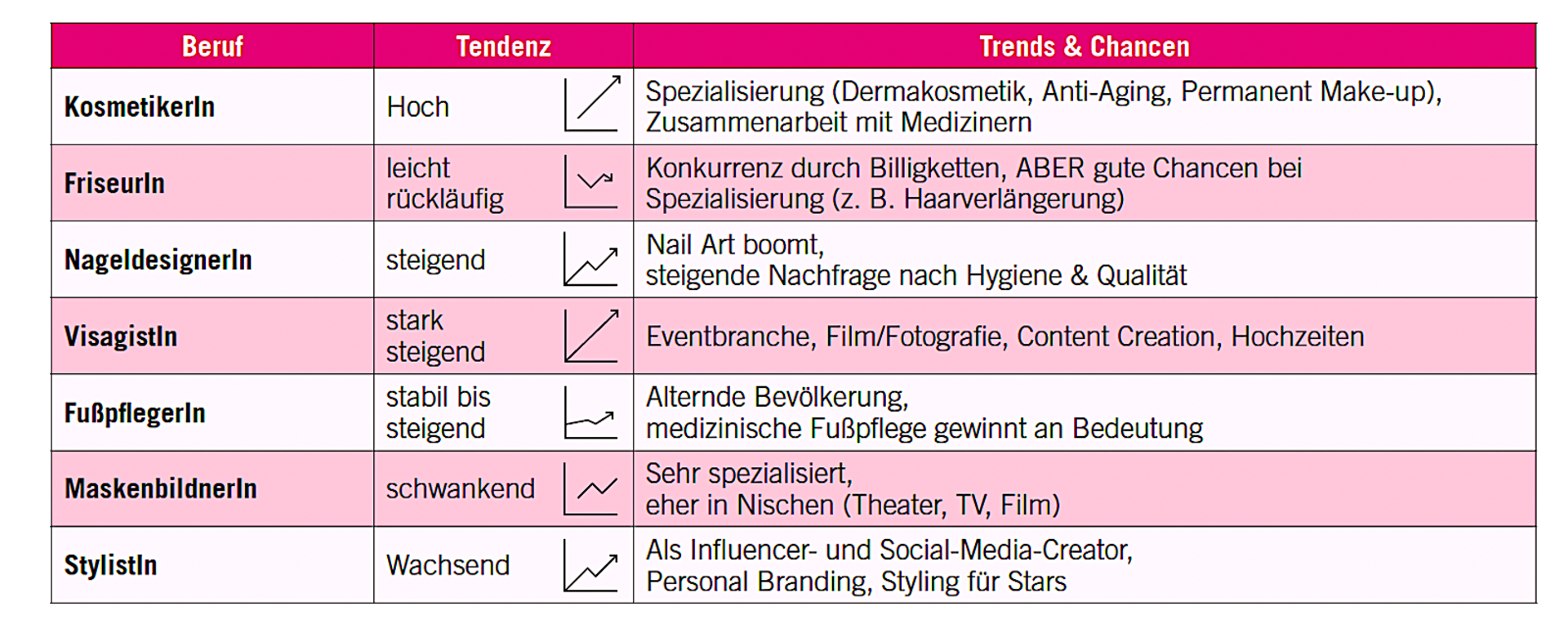 Die Zukunftsaussichten in der Schönheitsbranche sind prima. Immer mehr Menschen legen Wert auf ihr Aussehen und ihre Gesundheit, unabhängig von wirtschaftlichen Schwankungen. Besonders gefragt sind alle, die sich auf neue Trends und Techniken einlassen und eine Leidenschaft dafür entwickeln.
