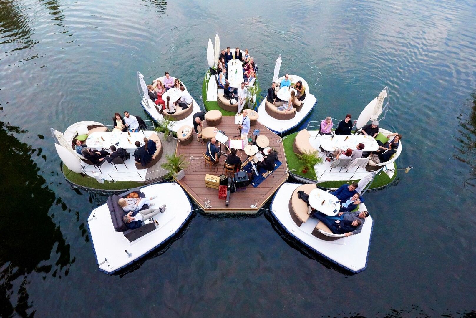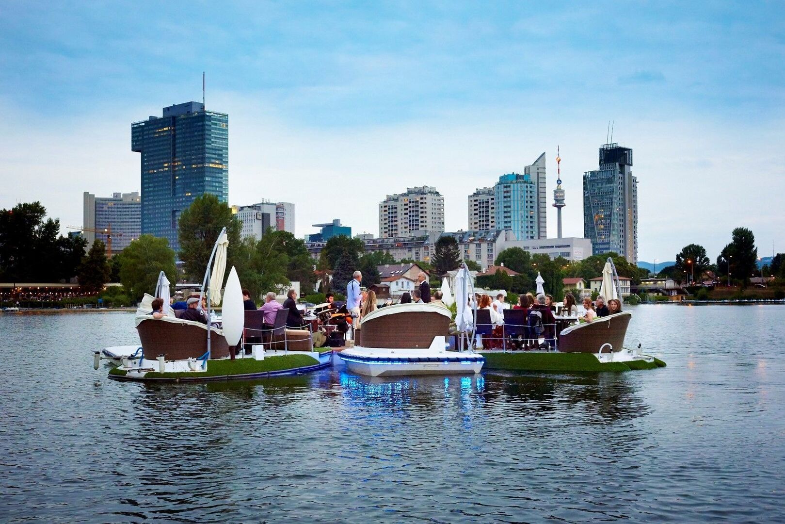 So haben Sie garantiert noch kein Konzert erlebt. Aquasonic heißt die neueste Attraktion, wo ein Konzerterlebnis mit einem kulinarischen Genuss perfekt kombiniert und auf der Alten Donau ins Szene gesetzt wird. Ein achteckiges Floß dient als schwimmende Bühne, rund herum docken acht Inselboote an. Die Idee hatte Bootsliebhaber Martin Mai, dem neben Aussehen und Funktionalität vor allem Emotionen ein großes Anliegen sind: „Ursprünglich habe ich das Kuschelboot für meine Freundin und mich entworfen, um abends den Sternenhimmel zu erkunden. Schritt für Schritt hat sich die Idee dahinter dann zu einem umfassenden Businesskonzept entwickelt“, erzählt Mai die Enstehungsgeschichte. Die Eilande sind stabil und belastbar, äußerst leicht, wendig und einfach zu bedienen. Ein Joystick sorgt für die simple Navigation, die im Zuge einer kurzen Einschulung erklärt wird.