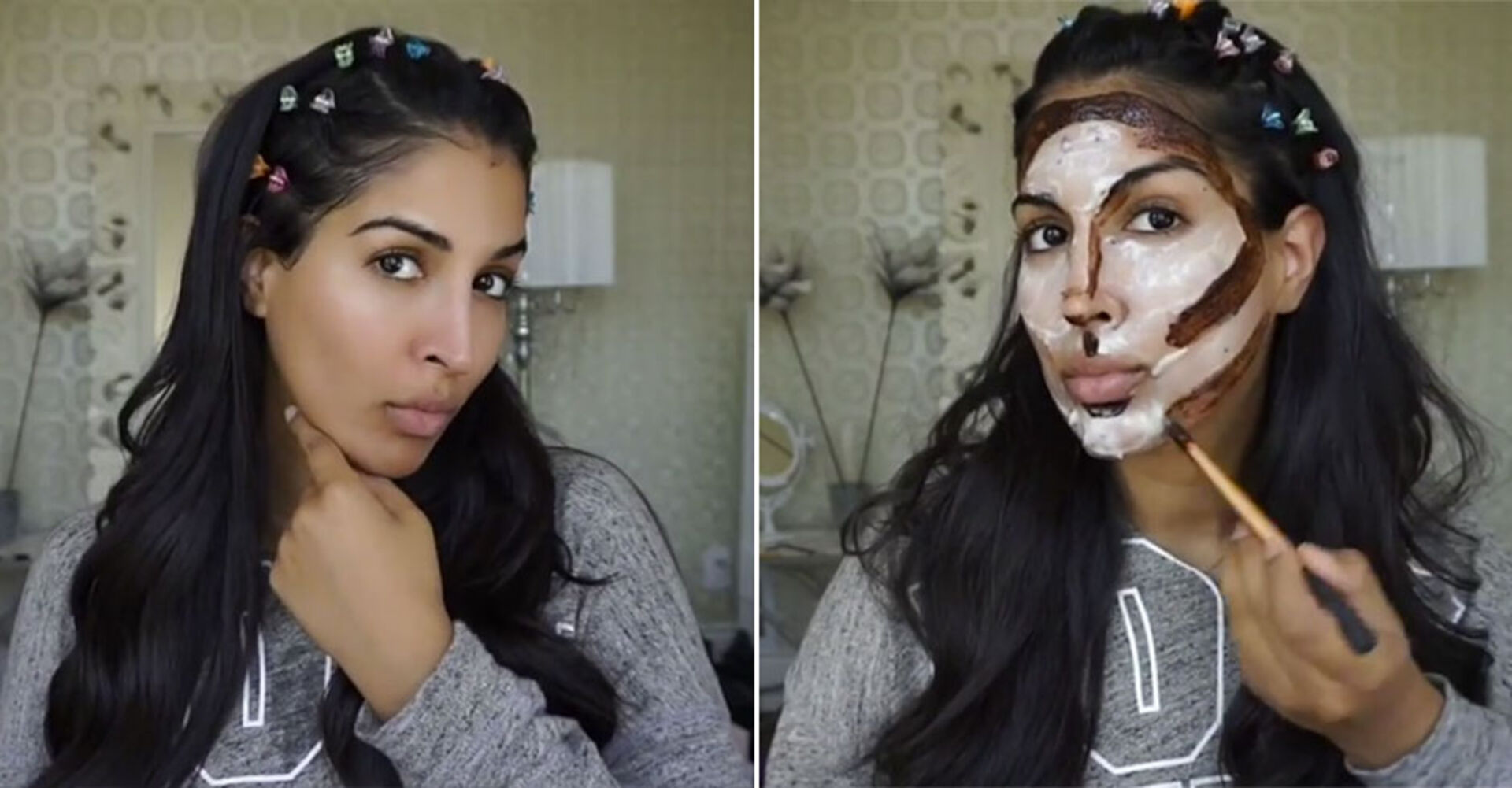 Instagram-Nutzerin Faradhukai nennt es die „Highlight and contour“ Maske und für uns sieht es einfach wie ein Gemisch aus Schokolade und Joghurt aus, das die Beauty-Expertin hier für ihr Contouring ohne Make-up verwendet.