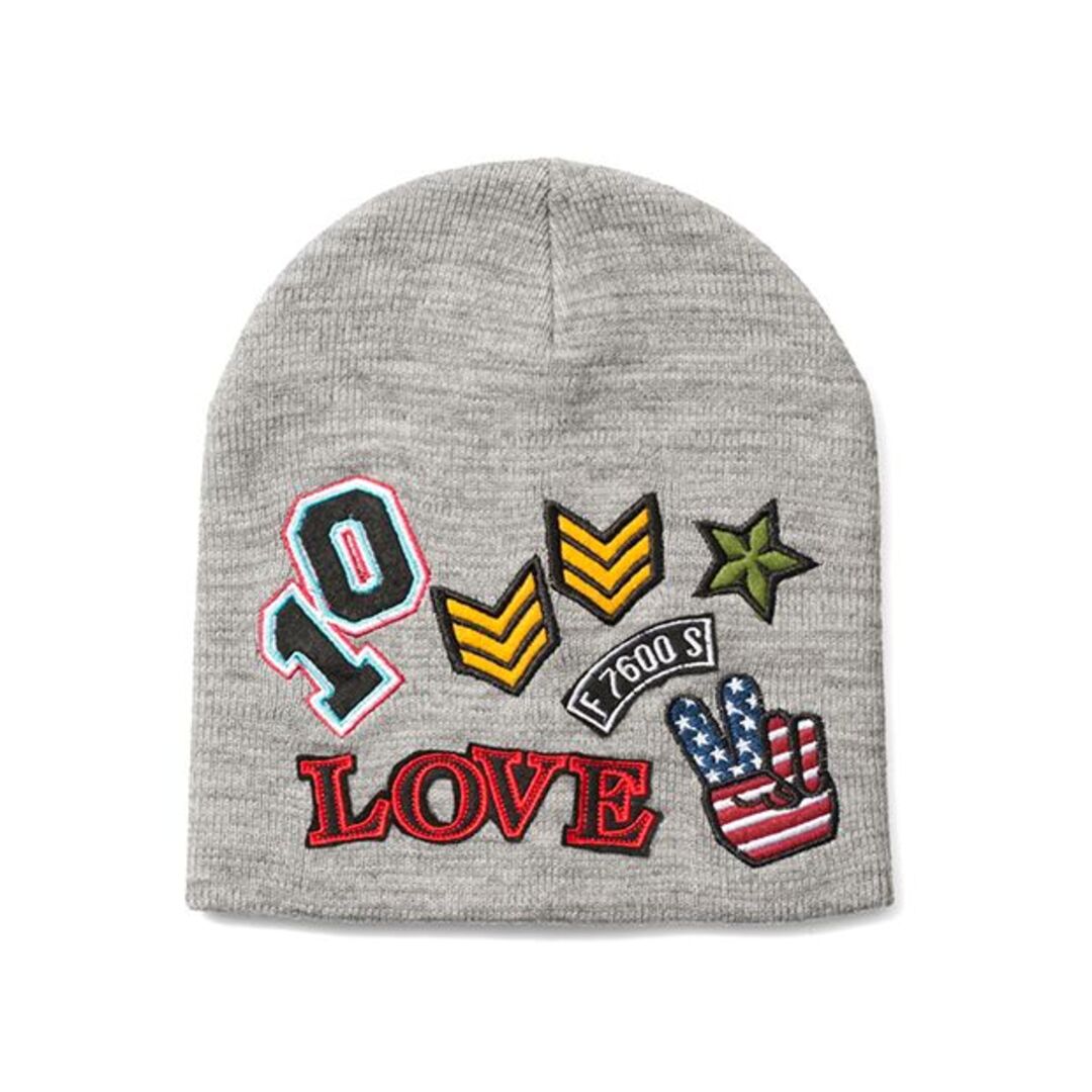 Hellgraue Beanie mit verschiedenen Patches von New Yorker. Um € 7,95
