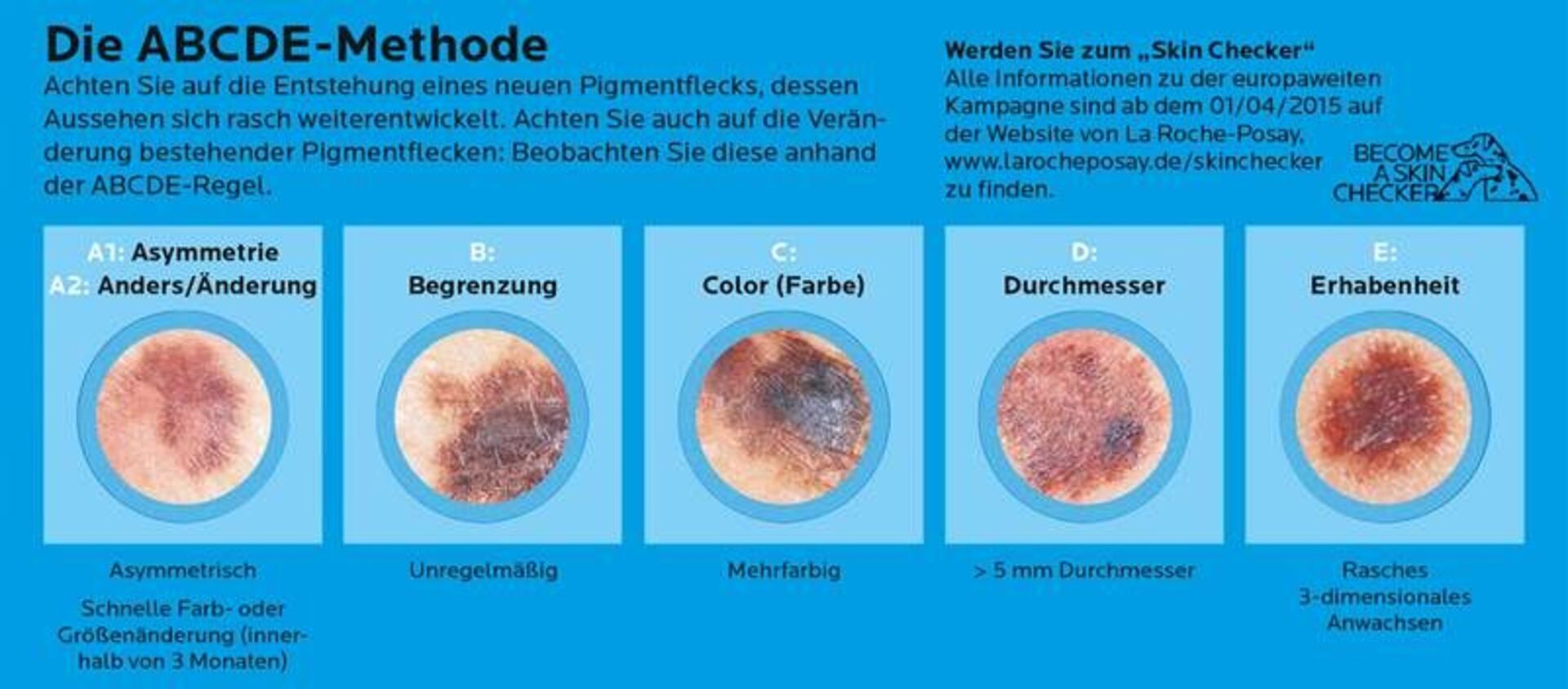 Doch wie kann man ein Melanom von einem "normalen" Muttermal unterscheiden? Bei der Identifizierung verdächtiger Flecken hilft die sogenannte ABCDE-Methode, die von Dermatologen entwickelt wurde: