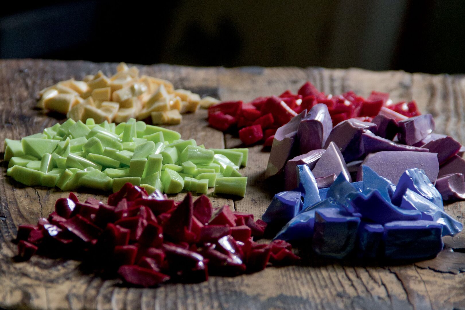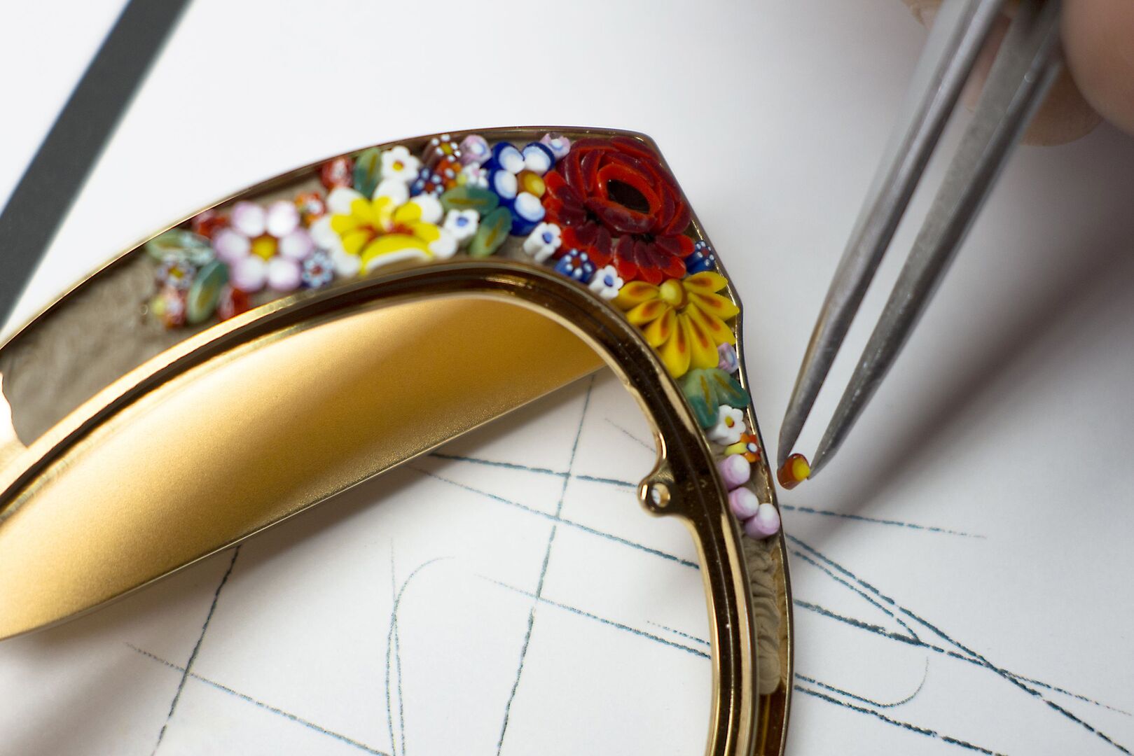 Der Vorgang wird ausschließlich per Hand von geübten Handwerkern ausgeführt, die spezielles Know-how für diese Verarbeitung besitzen. Zur Realisierung der Mosaik-Blumenkompositionen wurden mehr als dreißig verschiedene Typologien von gezogenen Glasfäden verwendet, die Blätter, Blüten und Blütenstempel naturgetreu wiedergeben.