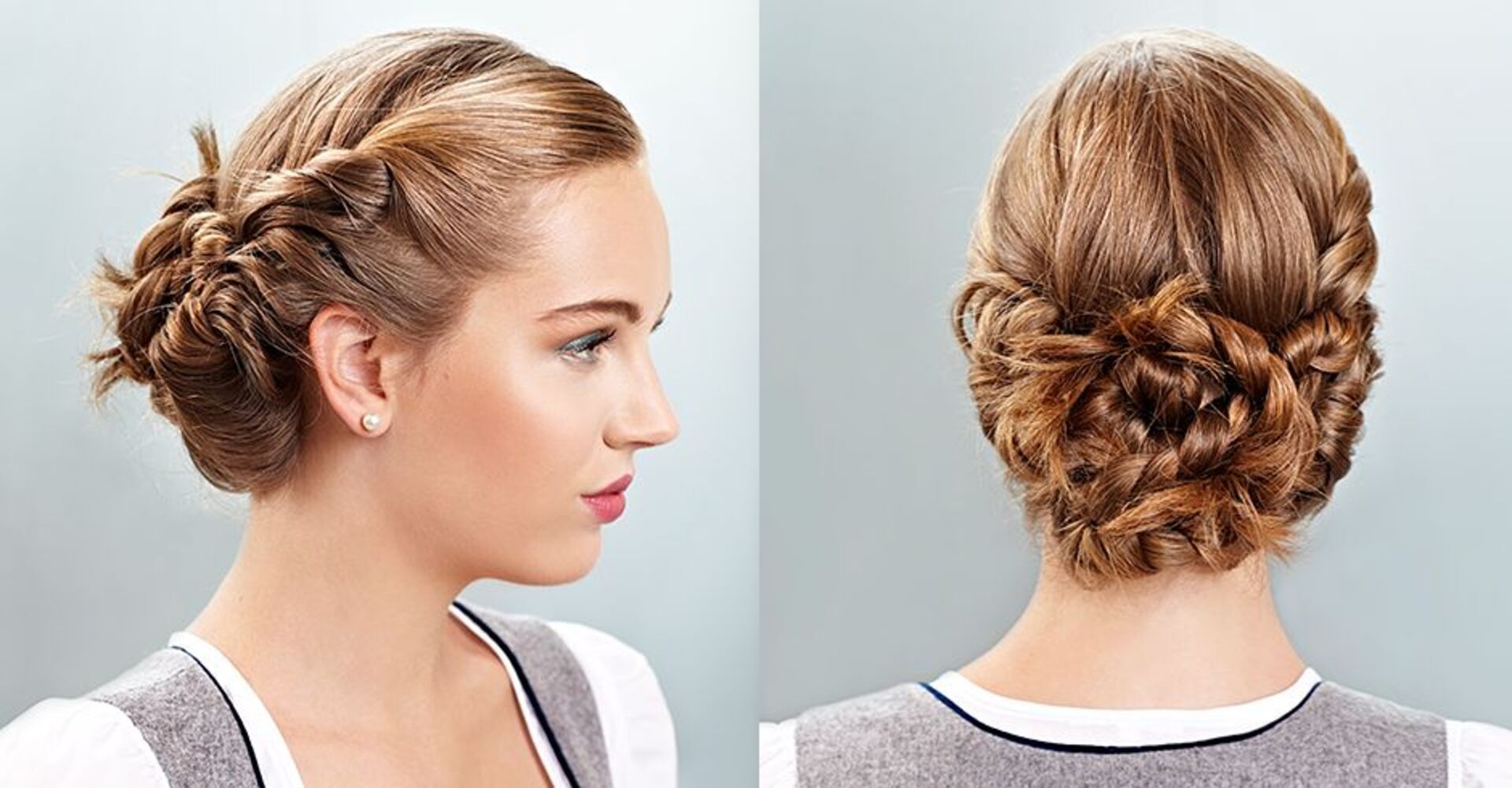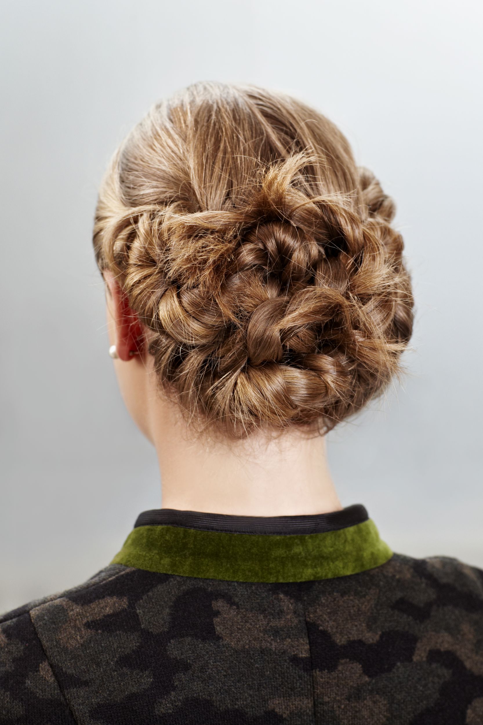 Step 3: Nun die restlichen Partien im Nacken zwirbeln, ineinander schlingen und gut feststecken. Hierbei einige Haarenden auslassen für einen gewollt unordentlichen Look. Als Finish etwas Glanz- und Haarspray über die Frisur geben.