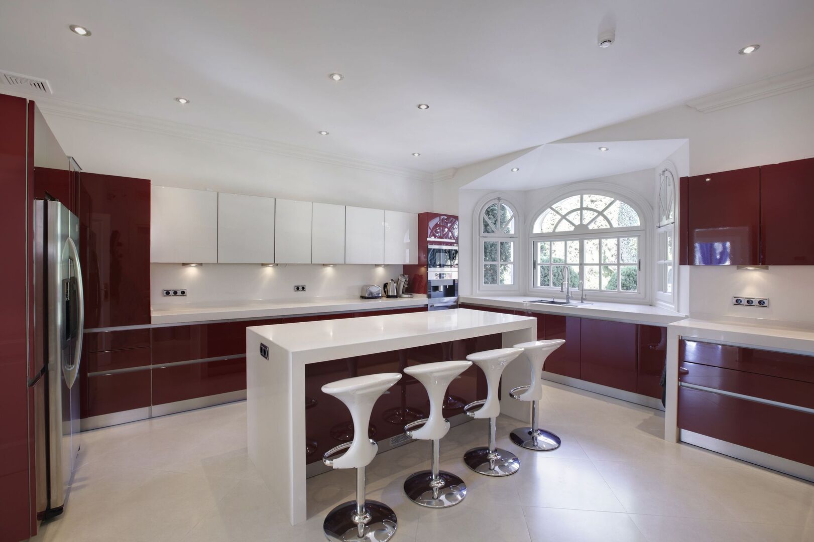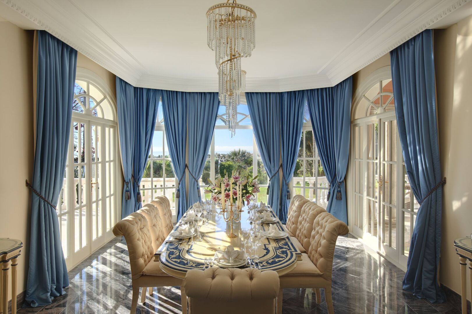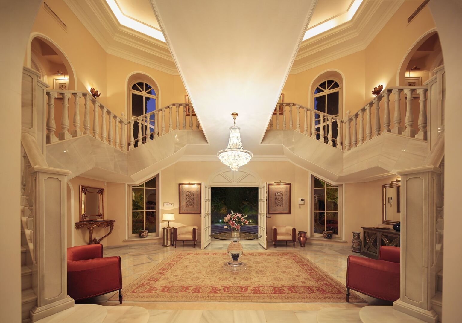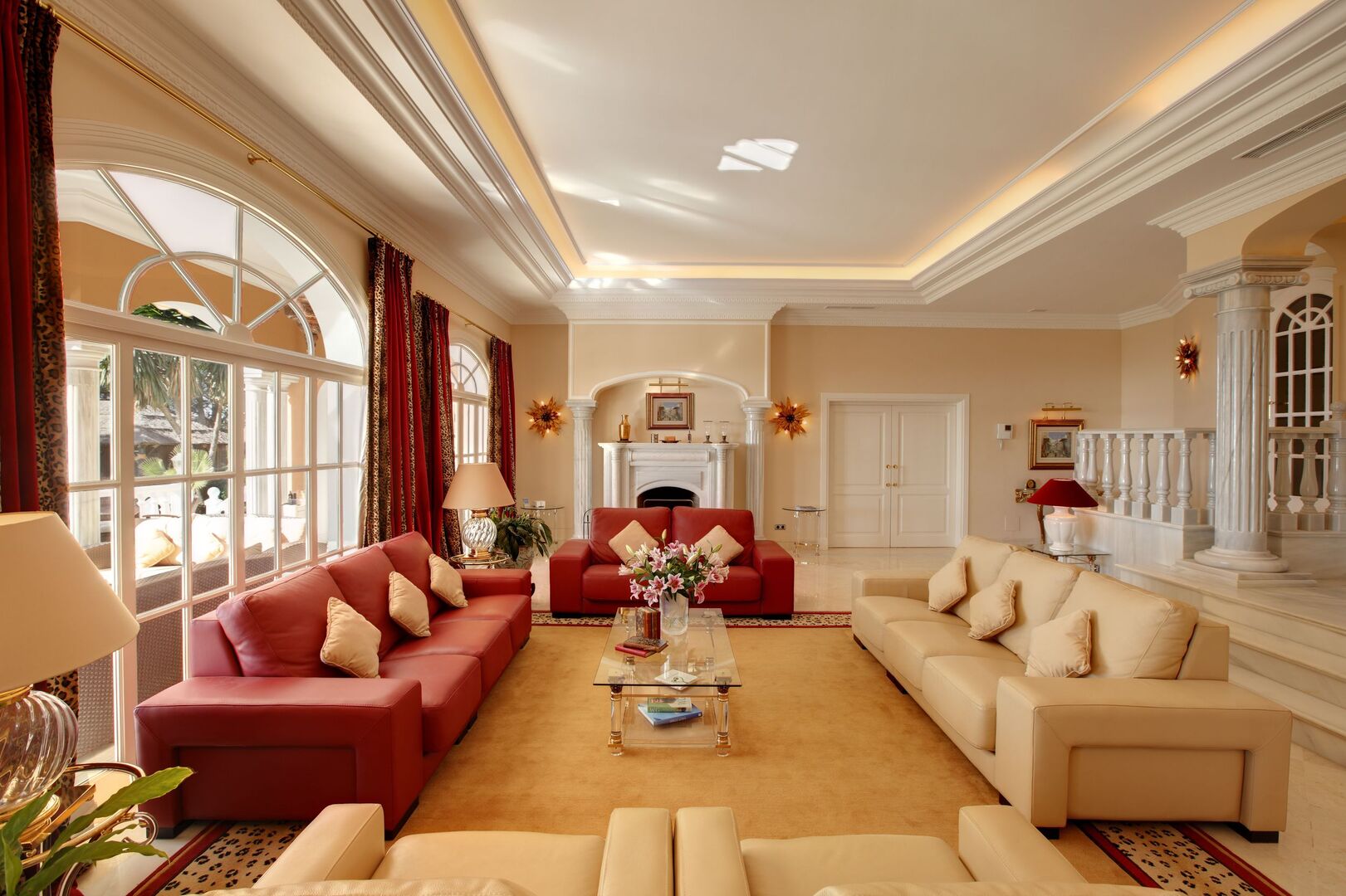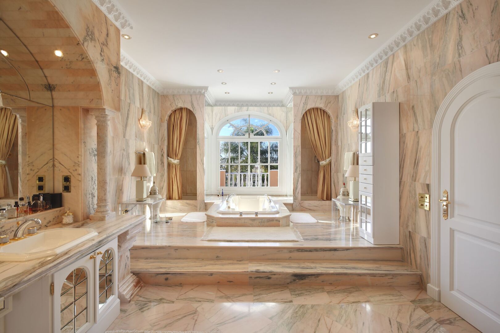 Die Luxusvilla mit Meerblick, die von der Immobilien-Beratung Engel & Völkers angeboten wird, verfügt über ingesamt 13 Zimmer auf rund 890 Quadratmeter Wohnfläche. Zusätzlich findet man dort eine 240 Quadratmeter große Terasse und drei Garagen. Die hohen Ansprüche des extravaganten Vorbesitzers spiegeln sich in der gesamten Architektur und Ausstattung der Villa wider: In der Eingangshalle werden Besucher von einem prachtvollen Kronleuchter und einer Doppeltreppe im Kolonialstil empfangen. Das Hauptschlafzimmer erstreckt sich über zwei Ebenen.