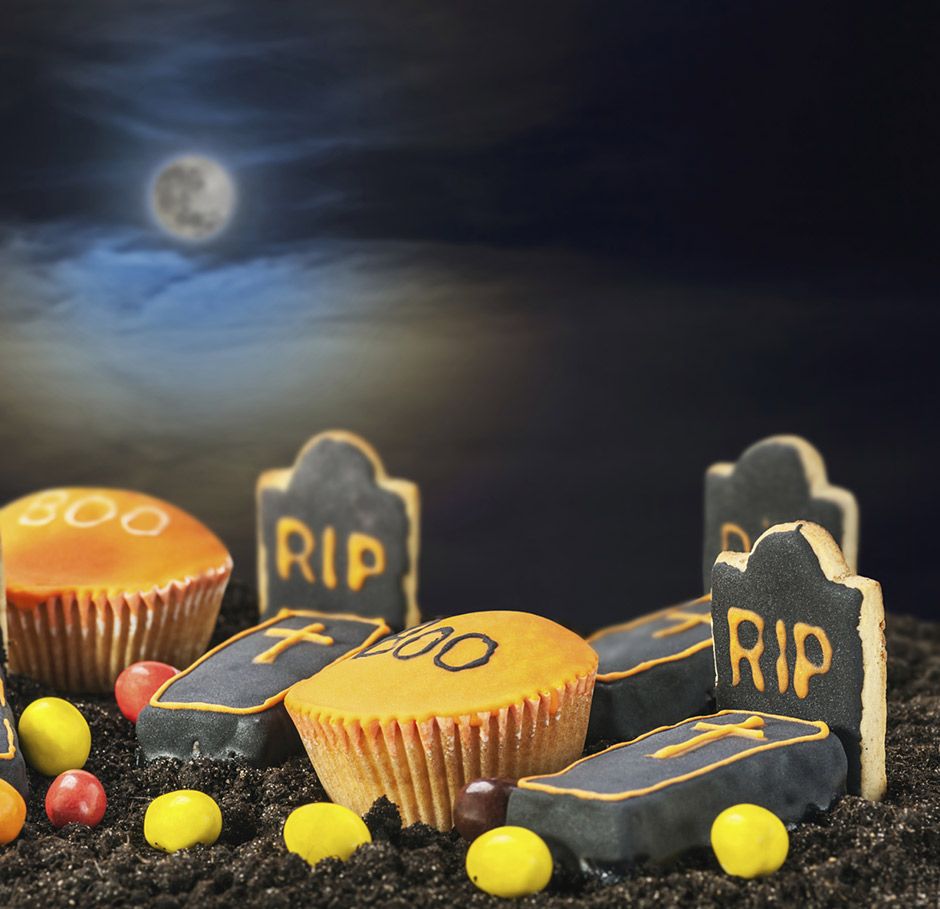 So eine Halloween-Nacht ist lang, da sollte das Essen nicht zu knapp bemessen sein, zumal das wohlig-schaurige Gruselfieber in so einer Nacht die Energieverbrennung ordentlich ankurbelt. Klassischen Süßspeisen und herbstlichen Leibgerichten einen Touch von Halloween zu verpassen, ist gar nicht schwer. Mit selbst gemachten Glasuren aus Fruchtsirup oder Lebensmittelfarbe aus dem Handel, Zuckerguss- und Marzipan-Figuren oder -Dekor lassen sich schnell die nötigen Effekte erzielen. Hier ein paar Rezepte:
