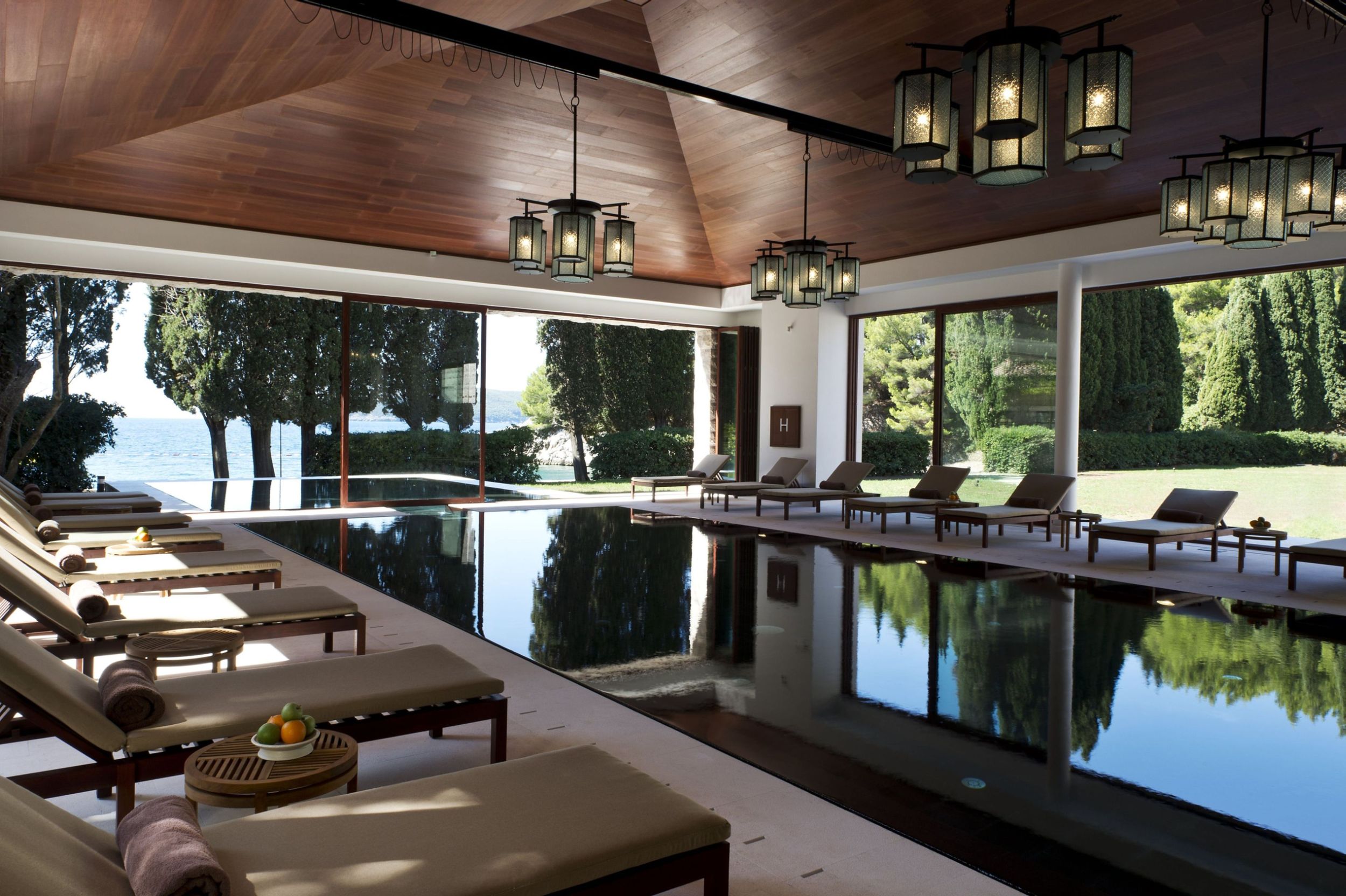 An drei Seiten von Pinien und Zedern umgeben liegt das Spa etwas zurückgesetzt nahe Queen’s Beach auf dem Festland. Die Gebäude aus weißem Stein sind mit ihren roten Ziegeldächern der Architektur der Villa Miločer nachempfunden. Von der Spa-Rezeption gehen vier 65 Quadratmeter große Treatment-Räume ab, die jeweils über eigene Ruhezonen verfügen. Im Sommer laden die privaten Terrassen mit Blick in den Garten und über den angrenzenden Teich zum Ausruhen ein, im Winter wärmt ein Kamin die Gäste. Saunen, Dampfduschen und kalte Plunge Pools in den drei Hydrotherapie-Suiten komplettieren das Angebot. Große Fensterfronten umspannen den geheizten, 24 Meter langen Indoor-Pool und ermöglichen ungehinderten Ausblick ins Grüne und auf das Meer. Der Pool geht in ein acht Meter langes Außenbecken über, zu dessen Seiten sich zwei großzügige Sonnenterrassen mit Liegestühlen erstrecken.