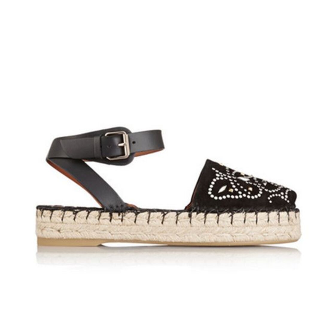 Nietenverzierte Espadrille-Sandalen aus Veloursleder und Leder von Valentino. Um ca. € 650,- (über net-a-porter.com)