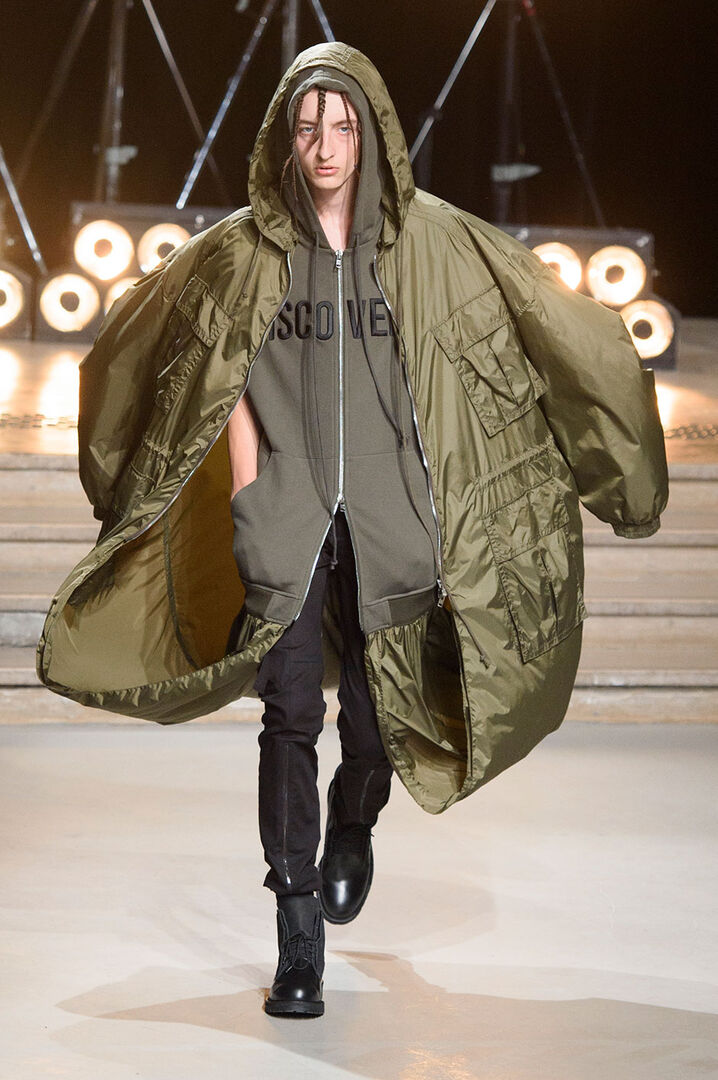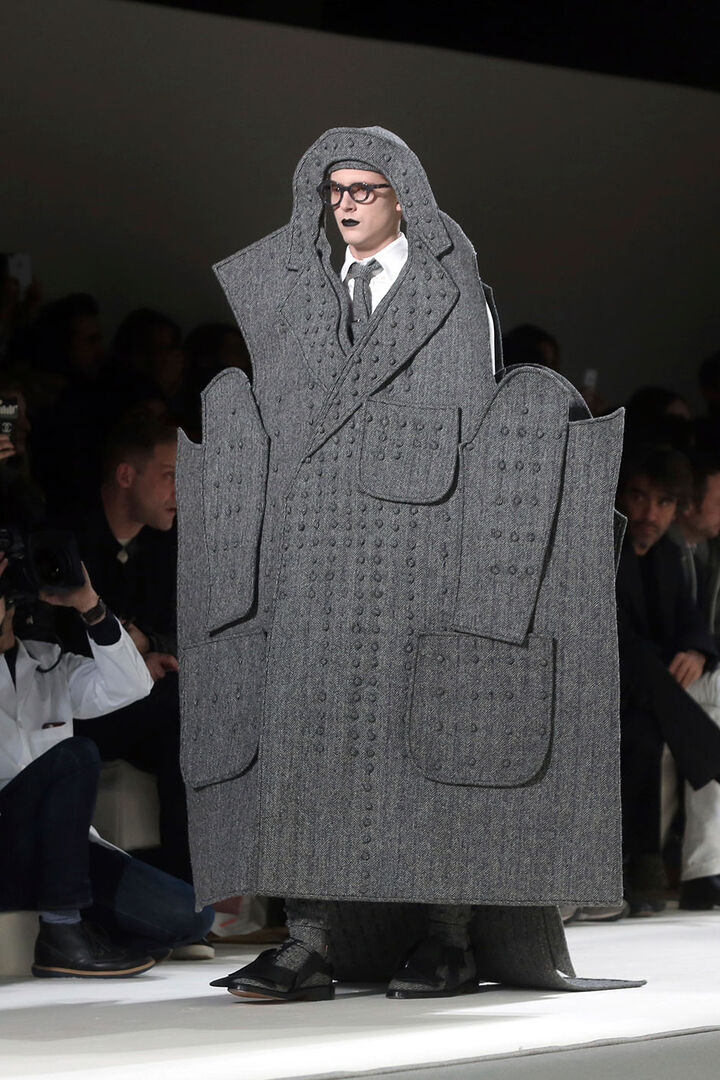 Thom Browne ist in diesem Jahr der Leader der Übertreibung. Natürlich soll man sich in seinen Outfits immer wohl fühlen und Platz haben, aber dieses "Sakko" macht U-Bahn-Fahrten beispielsweise alles andere als gemütlich, schließlich kleben alle anderen Gäste dadurch automatisch wieder an den Träger.