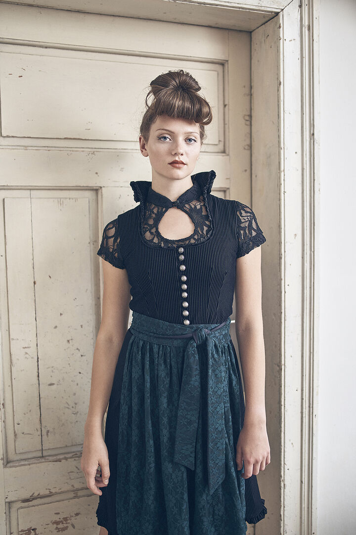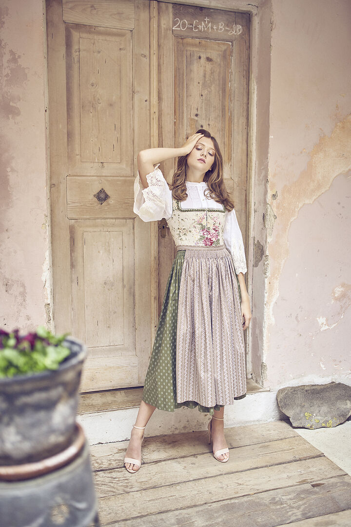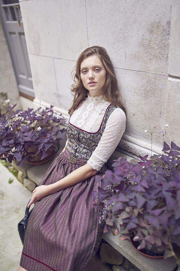 Unverblümt: Florales Dirndl mit Schürze im angesagten Mustermix um 289,– Euro von Trachtenmode Hiebaum zur hochgeschlossenen Spitzenbluse von Tramontana um ca…