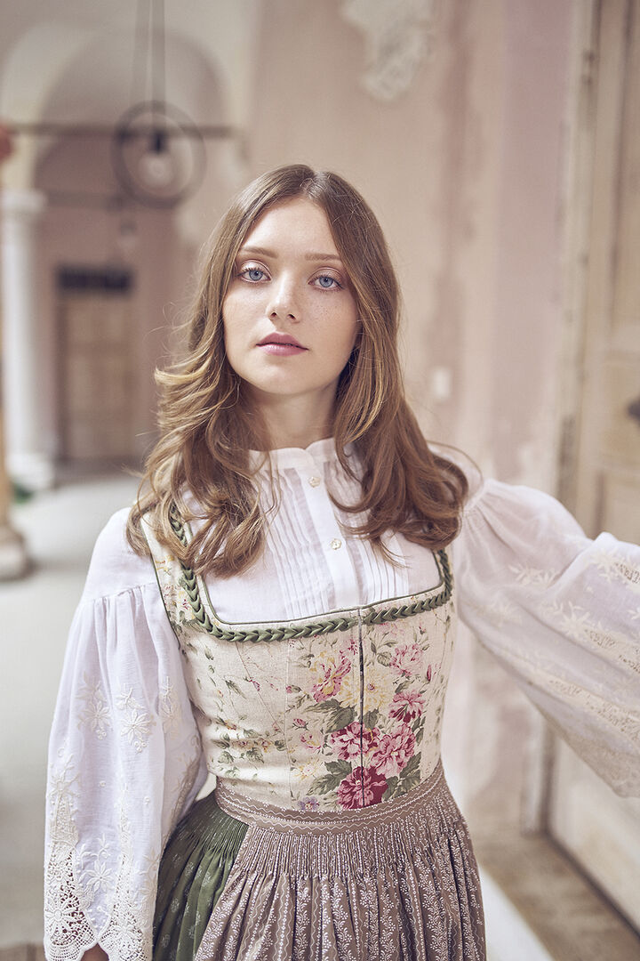 Verzaubert: Wunderschönes, geblümtes Dirndl „Elise“ von Lena Hoschek in gedämpften Tönen mit handgearbeiteten Rüschen und einem Leib aus Leinen um 1.375,– Euro…
