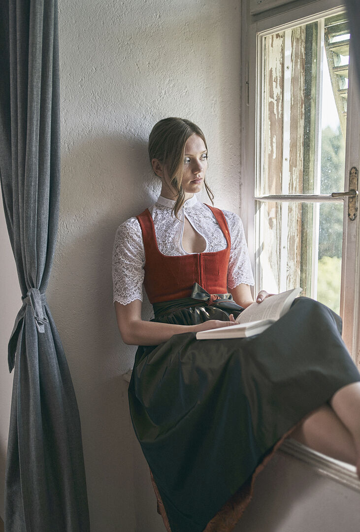 Traumhafte Aussichten: Hammerschmied Dirndl mit Leib aus Samt in herbstlichem Orange um ca. 309,– Euro zur Spitzenbluse mit Cut-out um ca. 65,– Euro…