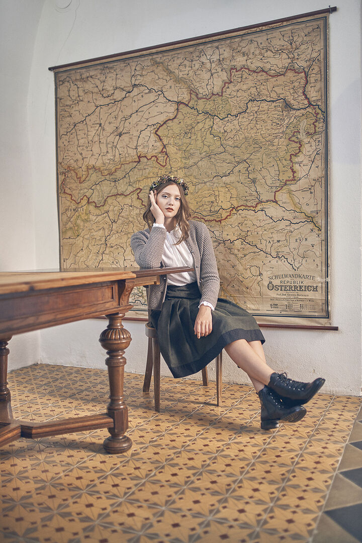 Mädchenhaft: Trachtenjacke aus Perlstrick von Gottseidank Trachten um 269,– Euro zur kompakten Baumwollbluse um 159,– Euro. Rock „Kreizweg“ von Rockmacherin…