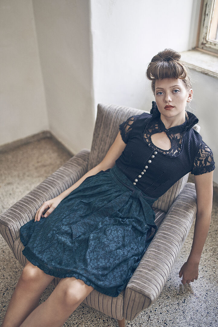 Wie eine sanfte Brise: Ärmellose Bluse in Türkis mit Häkelkragen von Country Line um 49,– Euro zum gestreiften Rock um 194,– Euro und Trachtenjacke um 324,–…