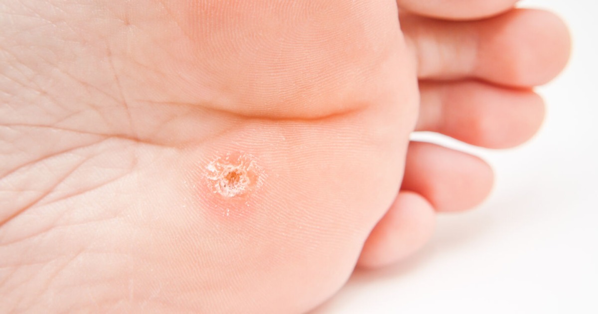 Sogenannten Dornwarzen (Verrucae plantares) treten meist an der Fußsohle, der Ferse oder manchmal auch zwischen den Zehen auf. In der Regel sind die Wucherungen hart, verhornt und mit schwarzen Pünktchen gespickt. Sie ragen nicht weit über die Haut hinaus – aber weit in die Haut hinein, wodurch Schmerzen entstehen. Daher ist es ratsam, sie so schnell wie möglich loszuwerden. Wichtig: Geduld – die kleinen Übeltäter sind oftmals hartnäckig und bedürfen einer mehrwöchigen Behandlung.