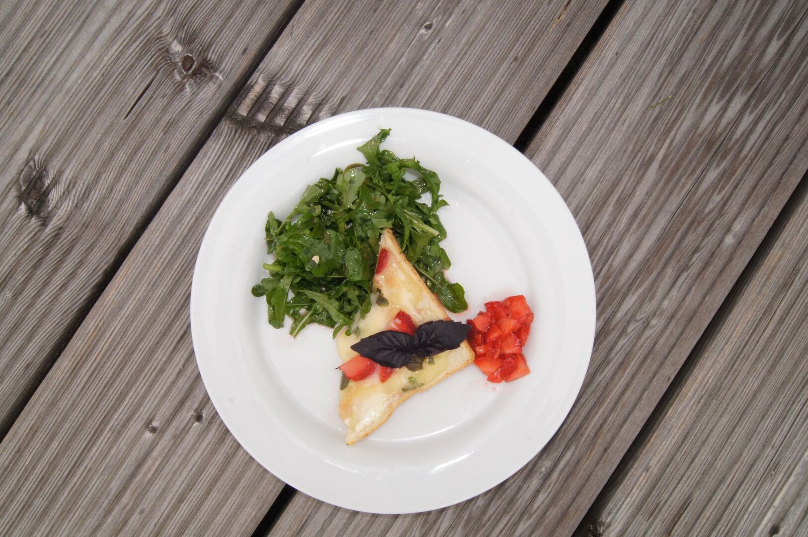 Toastbrotscheiben indirekt für ca. 10 Minuten bei 250° gratinieren. Danach in Dreiecke schneiden und mit Rucolasalat und etwas der marinierten Erdbeeren und Basilikum anrichten. Anstatt dem Stollenkäse kann auch ein anderer Schmelzkäse und anstatt dem Roten Bio-Brie kann auch ein Camembert verwendet werden. Je nach Saison können die Früchte variiert werden – im Herbst zum Beispiel mit Weintrauben.