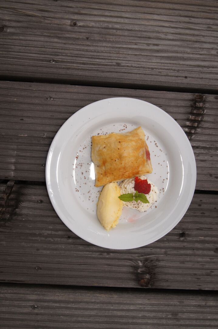 Nachspeise: Gefülltes Erdbeer-Bananen-Blätterteigtascherl mit Vanilleeis