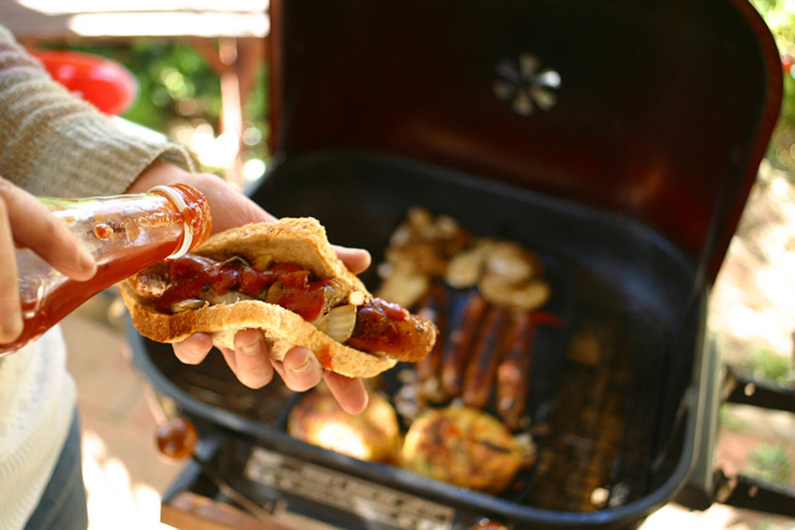 Ein gebratenes Würstel, Ketchup und Zwiebel in getoastetem Weißbrot. Das ist besonders bei Barbecues eines der beliebtesten Gerichte.