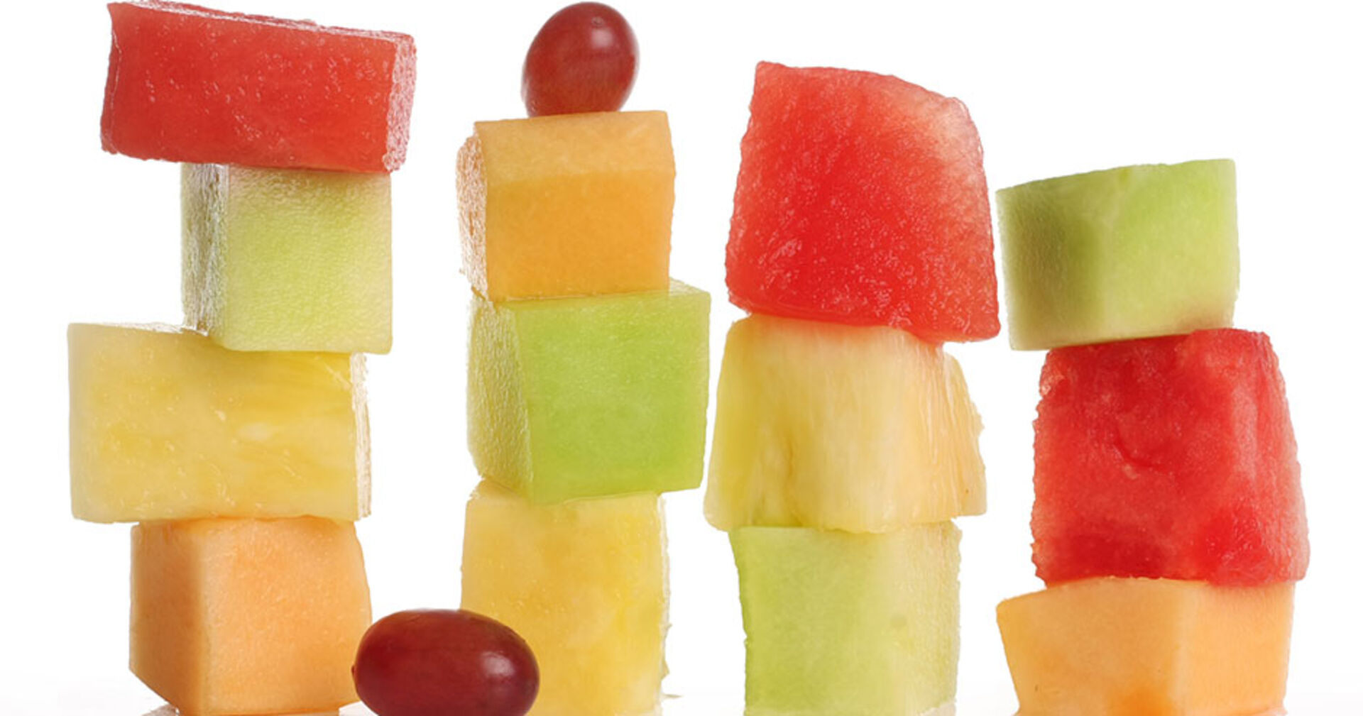 Gestapelt und in quadratischer Form essen alle Kinder gern Melonen aber auch jede andere Frucht. Mit einem Zahlstocher können die Früchte befestigt werden.