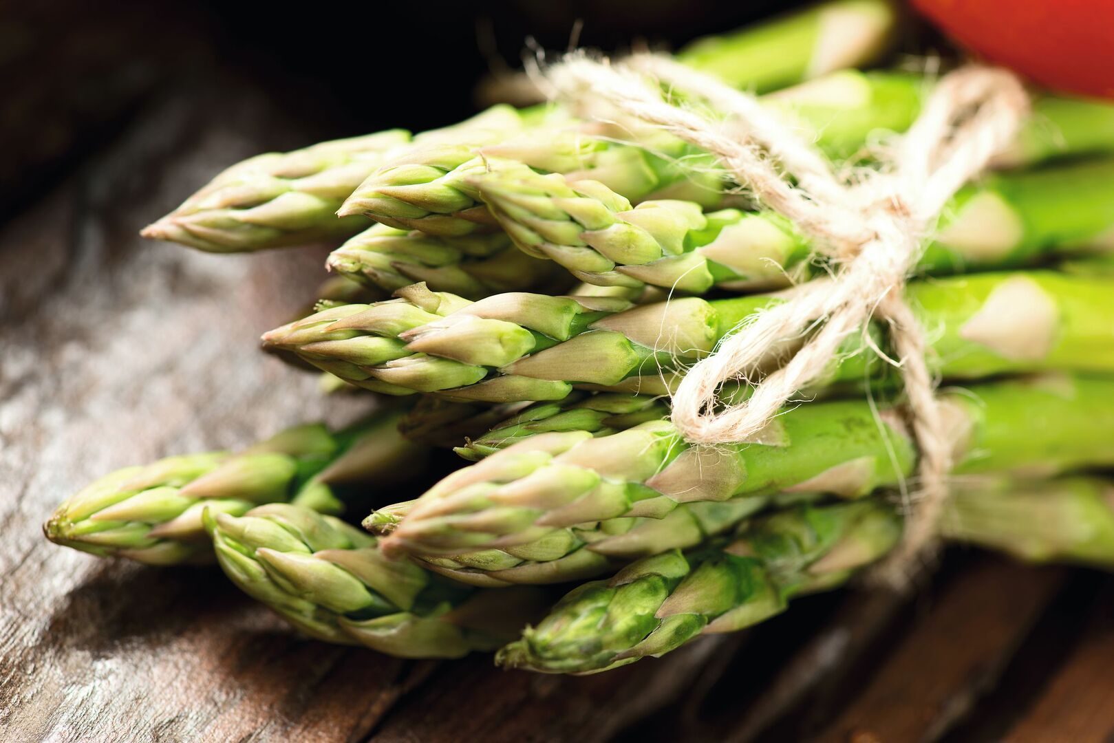 Den grünen Spargel im unteren Drittel schälen und die Enden abschneiden. Dann die Stangen in kleine Stücke schneiden. Die Hühnerbrühe mit etwas Salz und Zucker würzen, aufkochen und den Spargel etwa 3 Minuten darin garen. Die Spargelstücke aus dem Sud nehmen und in Eiswasser abkühlen. Das Schlagobers zu dem Hühnerfond geben und zu einer leichten Sauce einkochen, eventuell mit etwas Stärke binden. Die Scampi und den Spargel zur Sauce geben und 1 bis 2 Minuten gar ziehen lassen. Die kalte Butter unter das Ragout rühren und mit Salz, Pfeffer und Zitronensaft abschmecken. Zum Schluss den Kerbel unterheben.